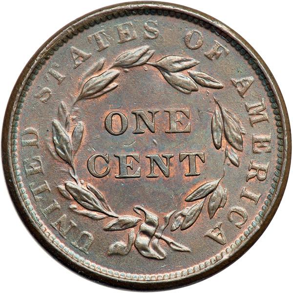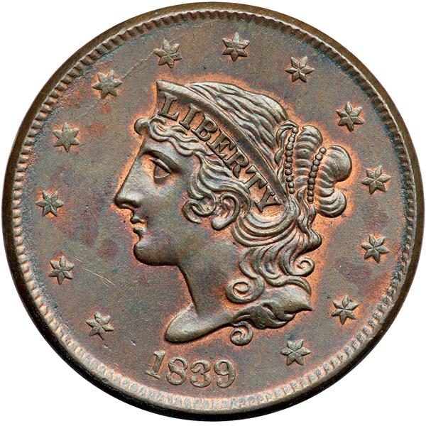 1839 Coronet Head Cent. PCGS graded MS-64 Brown. Glossy bluish steel and light olive brown with slightly faded mint red covering the protected areas on both sides. The surfaces are covered with attractive mint luster under the gloss and the eye appeal is excellent. There is some minor roughness along the dentil tips at stars 2-6, as struck. There is a very light and barely visible diagonal hairline scratch in the field right of star 2 and a short struck-through line over the E in CENT, as struck. These marks can help identify this cent but they are not the least bit distracting. M-LDS with all the fine obverse die cracks described by Wright visible, the strongest of these at stars 4-6. In addition there are clear die clashmarks inside the wreath. The left top of the E in STATES is weak but remains visible (this is lapped off the die in the late state). Called MS63 and tied for CC#4 in the Noyes census, his photo #25837. Removed from an NGC slab graded MS65BN (NGC label included). Our grade is MS62. Pop 3. None finer in Brown at PCGS for the variety. Only 4 graded at PCGS for the variety. DWH #2637 (PCGS # 37243) .
