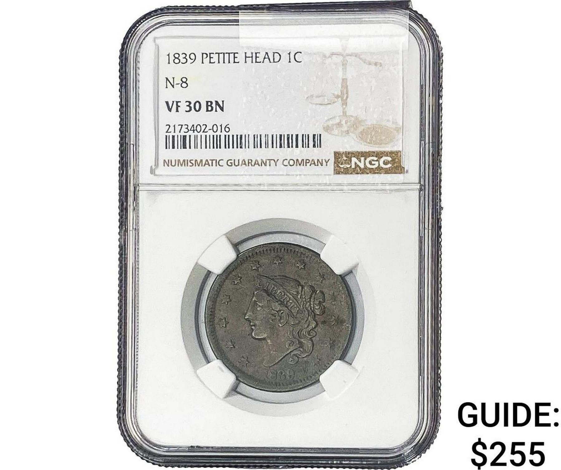 1839 Coronet Head Large Cent NGC VF30 BN Pet. Head