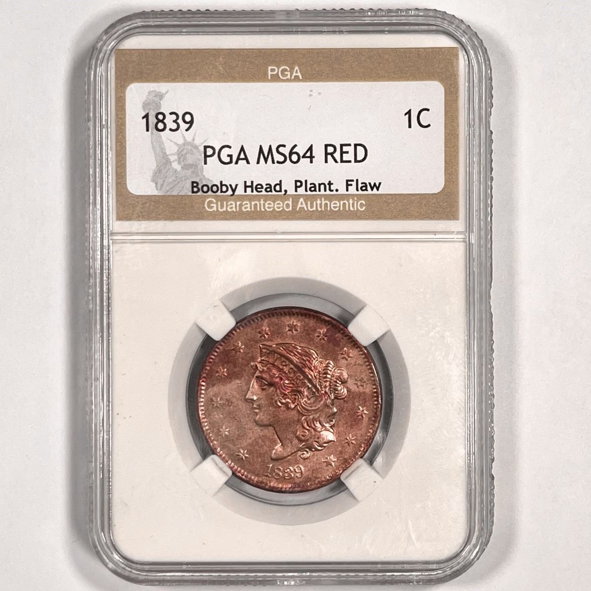 1839 Coronet Head Large Cent PGA-MS64 Booby Head,