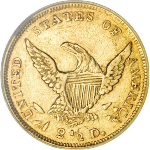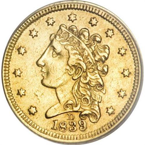 <B>1839-D $2 1/2 --Cleaned--ANACS. AU50 Details.</B></I> Variety 1-A. Weak Stem. The first quarter eagle produced at the Dahlonega Mint and the only Classic Head quarter eagle coined at that facility define the two-fold importance of the date. Two die pairs, one obverse and two different reverses, were required to produce 13,674 coins. The varieties are immediately distinguished by either a bold or weak branch stem above the D in the denomination. Lightly cleaned yellow-gold surfaces are minimally abraded.<BR><BR><B>Coin Engraver:</B> William Kneass<BR><BR><b>Shipping:</b> Coins & Currency (<a target="_blank" href="http://www.heritageauctions.com/common/shipping.php">view shipping information</a>)