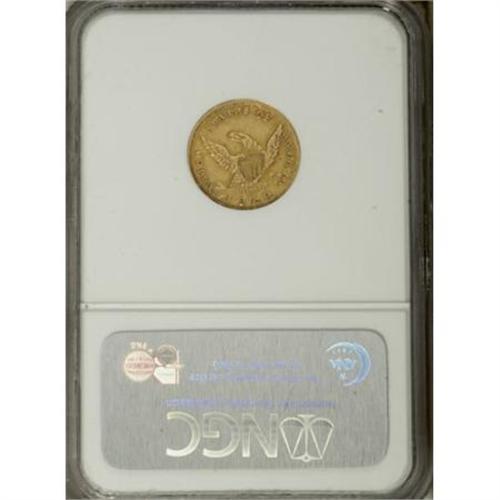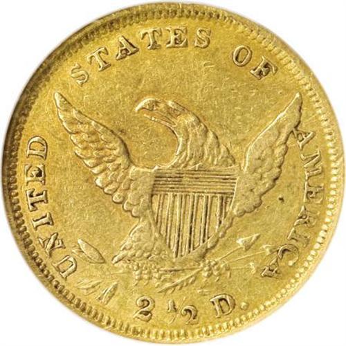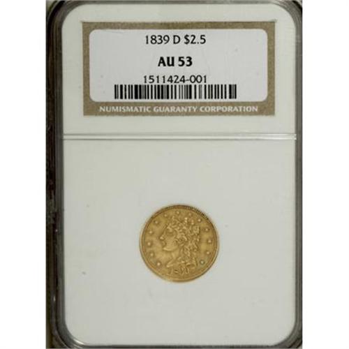<B>1839-D $2 1/2 AU53 NGC.</B></I> Variety 1-A. Weak Stem. The first quarter eagle produced at the Dahlonega Mint and the only Classic Head quarter eagle coined at that facility define the two-fold importance of the date. Two die pairs, one obverse and two different reverses, were required to produce 13,674 coins. The varieties are immediately distinguished by either a bold or weak branch stem above the D in the denomination. Rarity is approximately equal for each. Slight central weakness is evident on each side, with rich green-gold color that is accented by hints of subtle orange toning. Minor hairlines and light abrasions are evident on each side.<BR><BR><B>Coin Engraver:</B> William Kneass<BR><BR><b>Shipping:</b> Coins & Currency (<a target="_blank" href="http://www.heritageauctions.com/common/shipping.php">view shipping information</a>\)
