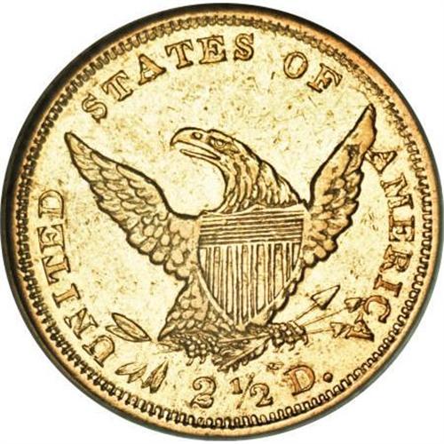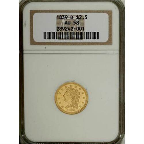 <B>1839-D $2 1/2 AU58 NGC.</B></I> McCloskey-A, R.3. The "Weak Stem" variant, so named for the ill-defined olive branch on the reverse. Few Southern branch mint gold issues enjoy the consistent, enduring popularity as this early date. Though Winter rates the 1839-D as one of the more available Dahlonega quarter eagles overall, its status as the only Classic Head quarter eagle from that Georgia facility creates additional demand.<BR> The present coin shows typical striking characteristics for the issue, including softness at the centers of the stars and a touch of weakness on the hair, yet the overall detail is pleasing. The pale lemon-gold surfaces harbor subtle radiance despite a number of tiny, scattered marks. Only a hint of friction on the highpoints of each side precludes a Mint State designation. Census: 15 in 58, 15 finer (1/08).<BR><BR><B>Coin Engraver:</B> William Kneass<BR><BR><b>Shipping:</b> Coins & Currency (<a target="_blank" href="http://www.heritageauctions.com/common/shipping.php">view shipping information</a>)