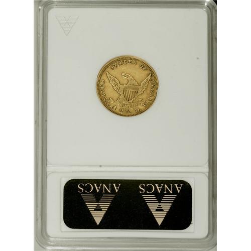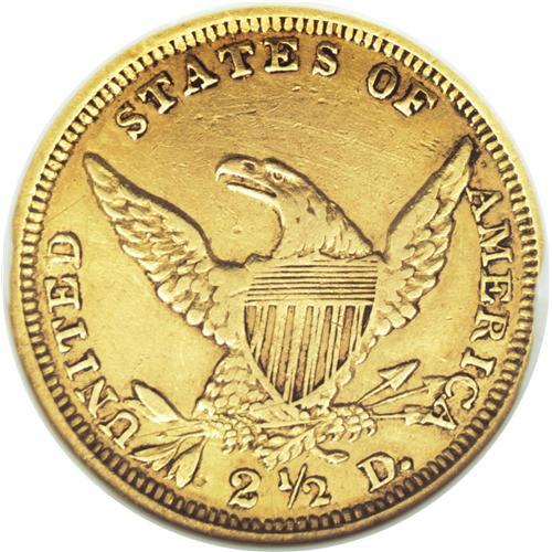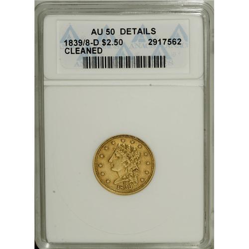 <B>1839-D $2 1/2 --Cleaned--ANACS. AU50 Details.</B></I> Variety 1-B, McCloskey-B, R.4. Coined from the stronger reverse die, which shows a full stem to the left of the D in the denomination. A lightly worn and luminous example of this important issue, the only one that combines the desirable Classic Head design and the Dahlonega mintmark. As a result, the 1839-D quarter eagle has experienced constant demand since collectors began paying attention to mintmarks. This softly struck yellow-orange representative has minor wear on the highpoints and muted luster. Light hairlines and a hint of gloss are noted on each side. Overall, a pleasing and desirable representative of this historic issue.<BR><BR><b>Shipping:</b> Coins & Currency (<a target="_blank" href="http://www.heritageauctions.com/common/shipping.php">view shipping information</a>)