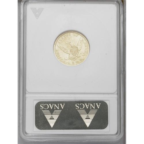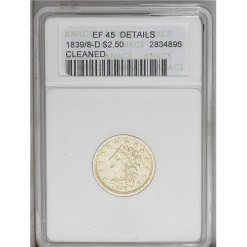 <B>1839-D<$2 1/2>--Cleaned--ANACS. XF45 Details.</B></I> Variety 1-B, R.4. Variety 1-B is easily recognized by the bold repunching of the final digit of the date (still referred to as 1839/8-D by ANACS) and by arrowheads firmly touching the final letters in AMERICA. The surfaces are unnaturally bright from the cleaning and show normal striking weakness on the reverse. Scarce and in demand nonetheless. <BR><BR><B>Important notice:</B> Heritage usually auctions material at the rate of 200-250 lots per hour. On some occasions eBay Live bid software or the Internet may not be able to keep up with the pace of the auction. We recommend placing a realistic absentee bid now as insurance to avoid disappointment. Occasionally the auctioneer may eliminate or reject an eBay Live bid, and the auctioneer may also reopen a lot after the close of the eBay live bidding (usually because we missed an audience bid), and may reject your bid even if it shows you as the winning bidder. By bidding via eBay Live, you agree that Heritage may award the lot to another bidder at its sole discretion under the circumstances described above or any other reasonable circumstances. Since eBay bids are not shown to us until we open the lot on the floor, we treat those bids just like floor bids. In most cases the floor responds before the eBay bid is presented to us, due to Internet lag time, so for consistency we have made it a policy that floor bids are always considered first over tie eBay live bids. Also please note that all Heritage lots purchased through eBay Live carry a 20% Buyer's Premium. Please make sure you read the Terms and Conditions before you bid. This lot is being auctioned in conjunction with a live floor auction by Heritage Galleries & Auctioneers. All final auction and invoice information will be supplied by Heritage Galleries & Auctioneers, and all other information should be considered preliminary. Lot:2350 <BR><BR><B>Winning Notification and Billing:</B> After the FINAL session in this auction is complete, Heritage will send e-mail and snail mail invoices. This process normally takes several days. All final auction and invoice information will be supplied by Heritage Galleries & Auctioneers, and all other information should be considered preliminary. <BR><BR>This auction will be conducted on a live auction floor and over the Internet through eBay Live. If you choose to place an absentee bid, please take a moment to <font color='#0000ff'><u><a href='http://pages.ebay.com/liveauctions/help/before/laabsentee.html'>learn how eBay Live absentee bidding works</a></u></font><font color='#000000'>