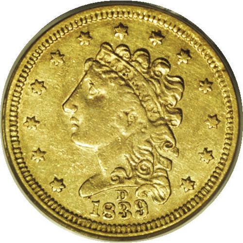 <B>1839-D $2 1/2 XF40 PCGS.</B></I> Variety 1-B, R.4. Identified by a bold branch stem located entirely to the left of the D in the denomination. Nearly 14,000 coins were minted; survivors are usually seen in VF or XF condition. This XF40 coin exhibits bright yellow-gold surfaces that show tints of light green. The obverse is slightly stronger than the reverse, which is usually not fully brought up on this issue. Overall, quite a nice coin.<BR><BR><b>Shipping:</b> Coin/Currency (<a target="_blank" href="http://www.heritageauctions.com/common/shipping.php">view shipping information</a>)