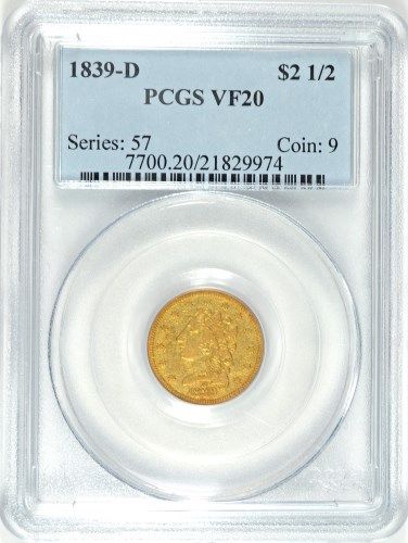1839-D $2.50 GOLD, PCGS VF-20, SUPER RARE LOW MINTAGE GREAT INVESTMENT!