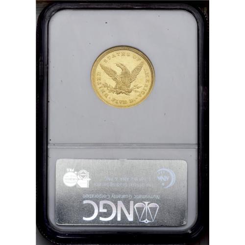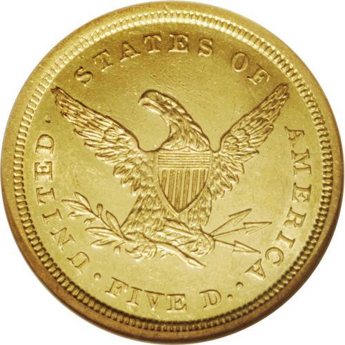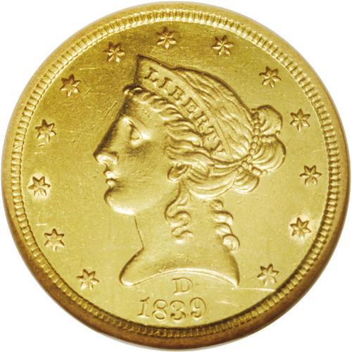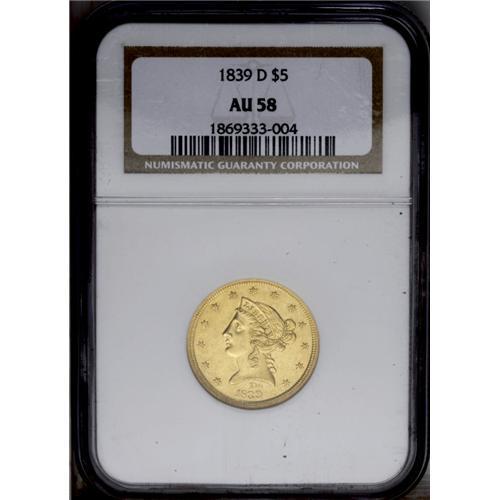 <B>1839-D<$5> AU58 NGC.</B></I> Variety 2-A. This needle-sharp and attractive Borderline Uncirculated piece exhibits ample glowing luster. The surfaces are smooth and clean to the unaided eye, and a few wispy marks near the eagle's head and above the highest arrow head are only when viewed beneath a glass. A stingy production of 18,900 pieces ensures a paucity of high grade survivors. Census: 13 in 58, 5 finer (2/06).