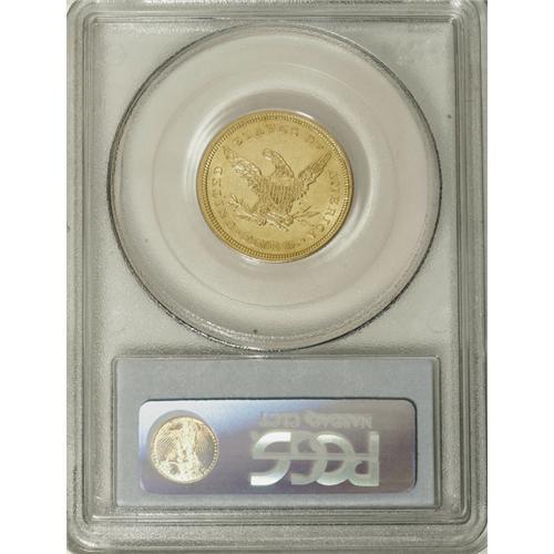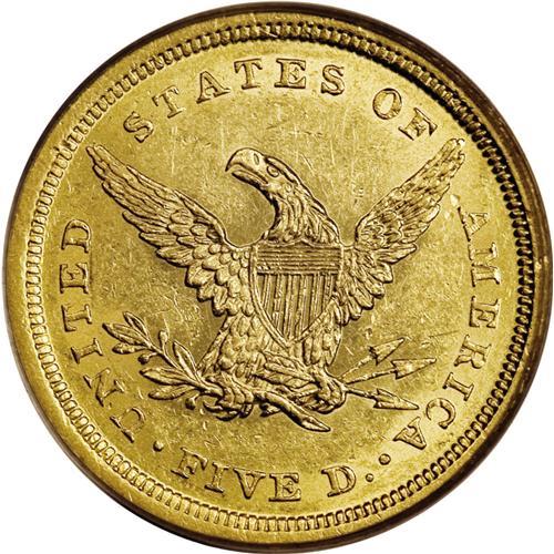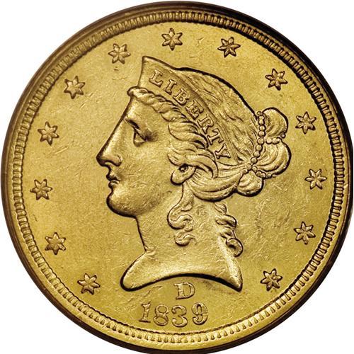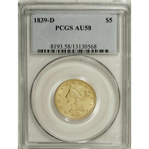 <B>1839-D $5 AU58 PCGS.</B></I> Variety 2-A. This is a splendid near-Mint example that represents the first year of issue for the Liberty Head half eagles, and the <I>only</B></I> year with mintmarks between the date and bust on the obverse. Beginning in 1840, the mintmark was moved to the reverse and its standard position below the olive stem. Technically, branch mint examples of the 1839 half eagles are one-year type coins. This piece has frosty luster with bright yellow-gold surfaces that exhibit typical scattered surface marks on each side. Seldom are examples found at this grade level, and only about a dozen finer Mint State pieces are known. Population: 2 in 58, 7 finer (4/07).<BR><BR><b>Shipping:</b> Coins & Currency (<a target="_blank" href="http://www.heritageauctions.com/common/shipping.php">view shipping information</a>)