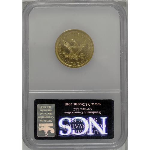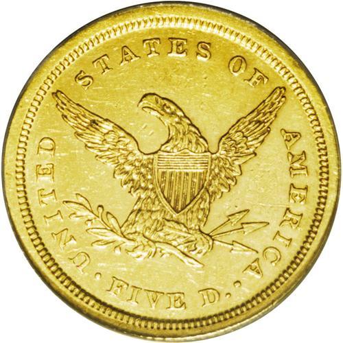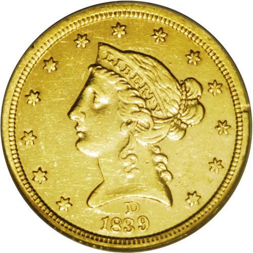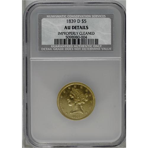 <B>1839-D<$5>--Improperly Cleaned--NCS. AU Details.</B></I> Variety 2-A. This piece is bright from a past wipe with a jeweler's cloth, but scant friction is detected, and limited to Liberty's eyebrow, nostril, shoulder, and other highpoints. Richly detailed, particularly on the eagle and the right side stars. All in all, an attractive example of this important obverse mintmark issue.