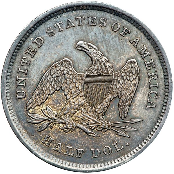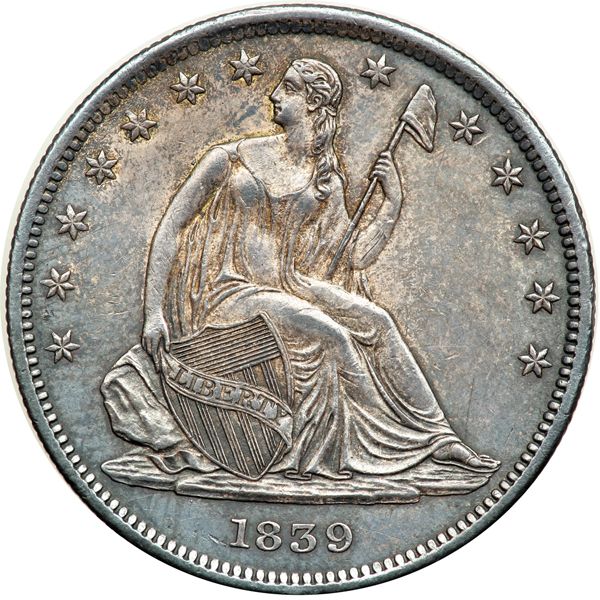 1839 Drapery. MS-60. Nicely toned. Well struck. Consigned too late for 3rd party grading. Has a short line on the arm holding the staff. Half dollars were in transition in 1834-40, with many Types and varieties, some with multiples in any one year, as happened in 1839. This is the final 1839 Seated Liberty design for the year, with drapery now inserted at Liberty's elbow, possibly to give the coin a look similar to the Robert Ball Hughes half dimes through quarters. The mint chose to keep Gobrecht's original model for the seated halves, 1839-91, instead of going with Hughes's modifications seen on the other denominations.