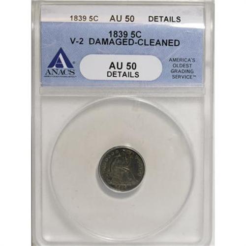 <B>1839 H10C No Drapery--Cleaned, Damaged--ANACS AU50 Details.</B></I> V-2. NGC Census: (1/214). PCGS Population (1/173). Mintage: 1,069,150. Numismedia Wsl. Price for NGC/PCGS coin in AU50: $115. (#4319)<BR><I>From The Al Blythe Collection of Half Dimes.</B></I><BR><BR><B>Coin Engraver:</B> Christian Gobrecht<BR><BR><b>Shipping:</b> Coins & Currency (<a target="_blank" href="http://www.heritageauctions.com/common/shipping.php">view shipping information</a>)