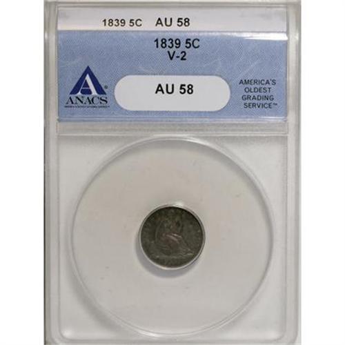 <B>1839 H10C No Drapery AU58 ANACS.</B></I> V-2. NGC Census: (20/184). PCGS Population (18/143). Mintage: 1,069,150. Numismedia Wsl. Price for NGC/PCGS coin in AU58: $185. (#4319)<BR><I>From The Al Blythe Collection of Half Dimes.</B></I><BR><BR><B>Coin Engraver:</B> Christian Gobrecht<BR><BR><b>Shipping:</b> Coins & Currency (<a target="_blank" href="http://www.heritageauctions.com/common/shipping.php">view shipping information</a>)