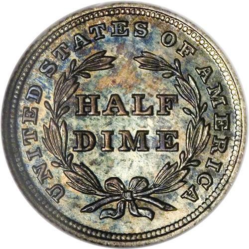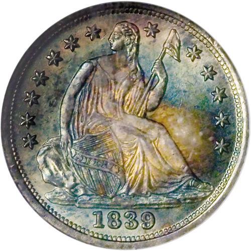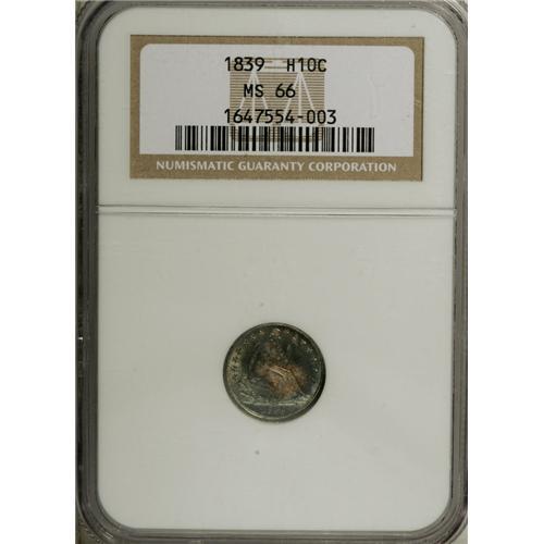 <B>1839 H10C No Drapery MS66 NGC.</B></I> The "No Drapery" description is accurate as far as it goes, but does not do justice to the changes made to the differences between the design and what would succeed it in mid-1840. In fact, these half dimes (and dimes) are a legitimate three year subtype within the Seated Liberty series. This piece is an excellent example of this subtype, with indigo, sea-green, and burgundy toning atop silky luster. Sharply struck, with barely a trace of weakness to be found. An extra point can be seen peeking out from behind star 11.<BR><BR><b>Shipping:</b> Coin/Currency (<a target="_blank" href="http://www.heritageauctions.com/common/shipping.php">view shipping information</a>)