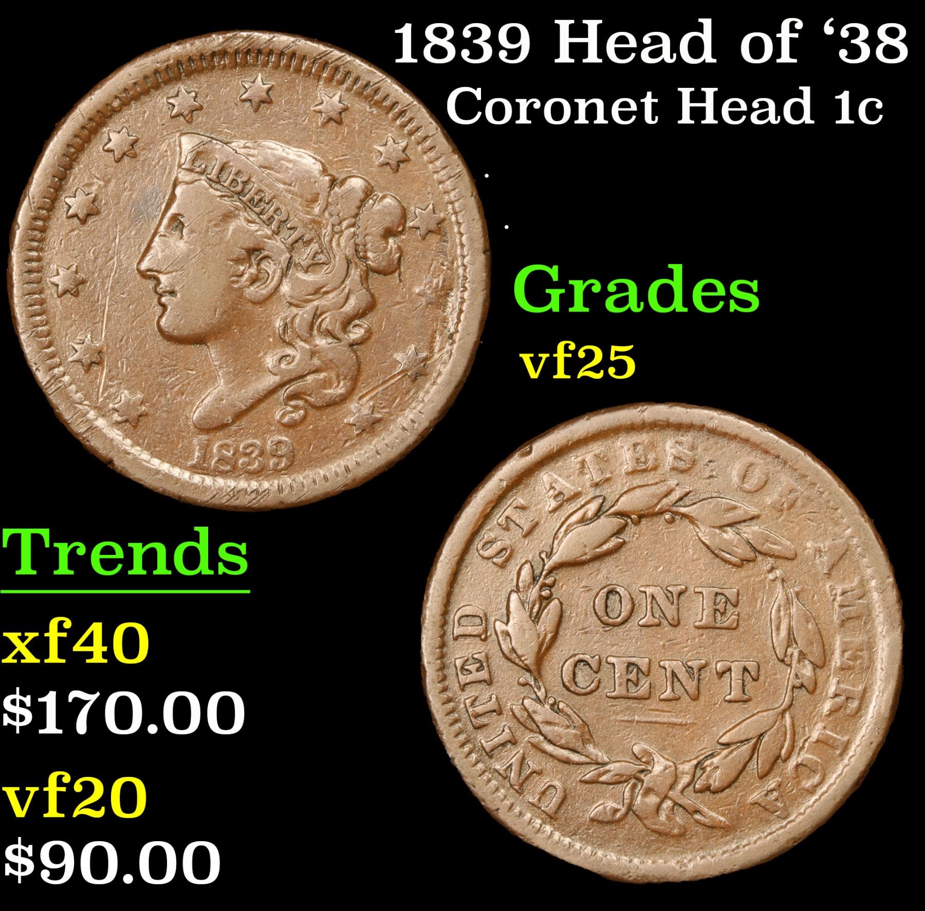 1839 Head of '38 Coronet Head Large Cent 1c Grades vf+.