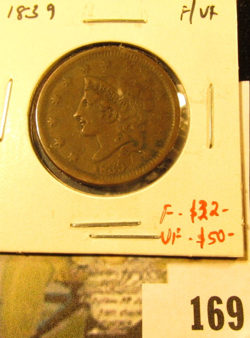 1839 Large Cent, F/VF, value F = $32, VF = $50