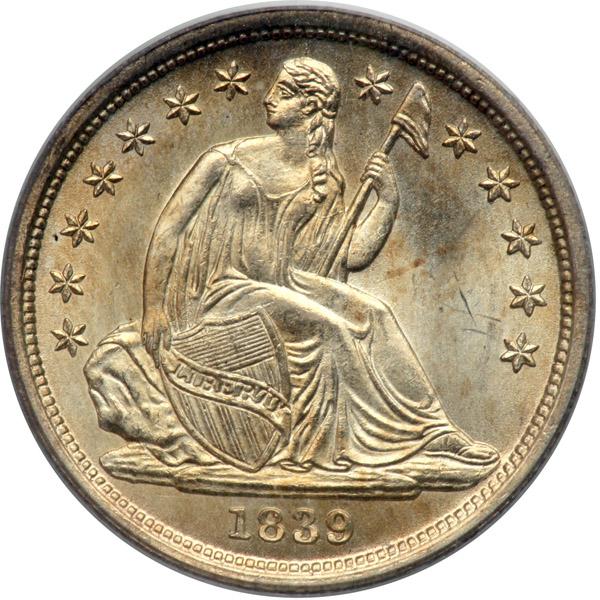 1839 Liberty Seated Dime No Drapery. PCGS graded MS-66. Light hint of gold toning. Well struck. Pop 10; 9 finer (PCGS # 4571) .