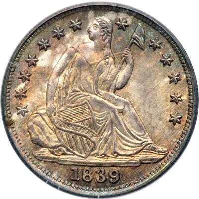 1839 Liberty Seated Half Dime. PCGS graded MS-67. Old green holder. Lovely blue and golden toning. A nice bold strike.Spectacular for the grade. Very few survivors could possibly equal the Superb technical merits and originality of this piece. In addition to its strong strike and nearly flawless surface quality, both sides are gleaming with mint brilliance. Precision strike on every device. Pop 5; none finer at PCGS. (PCGS # 4319).