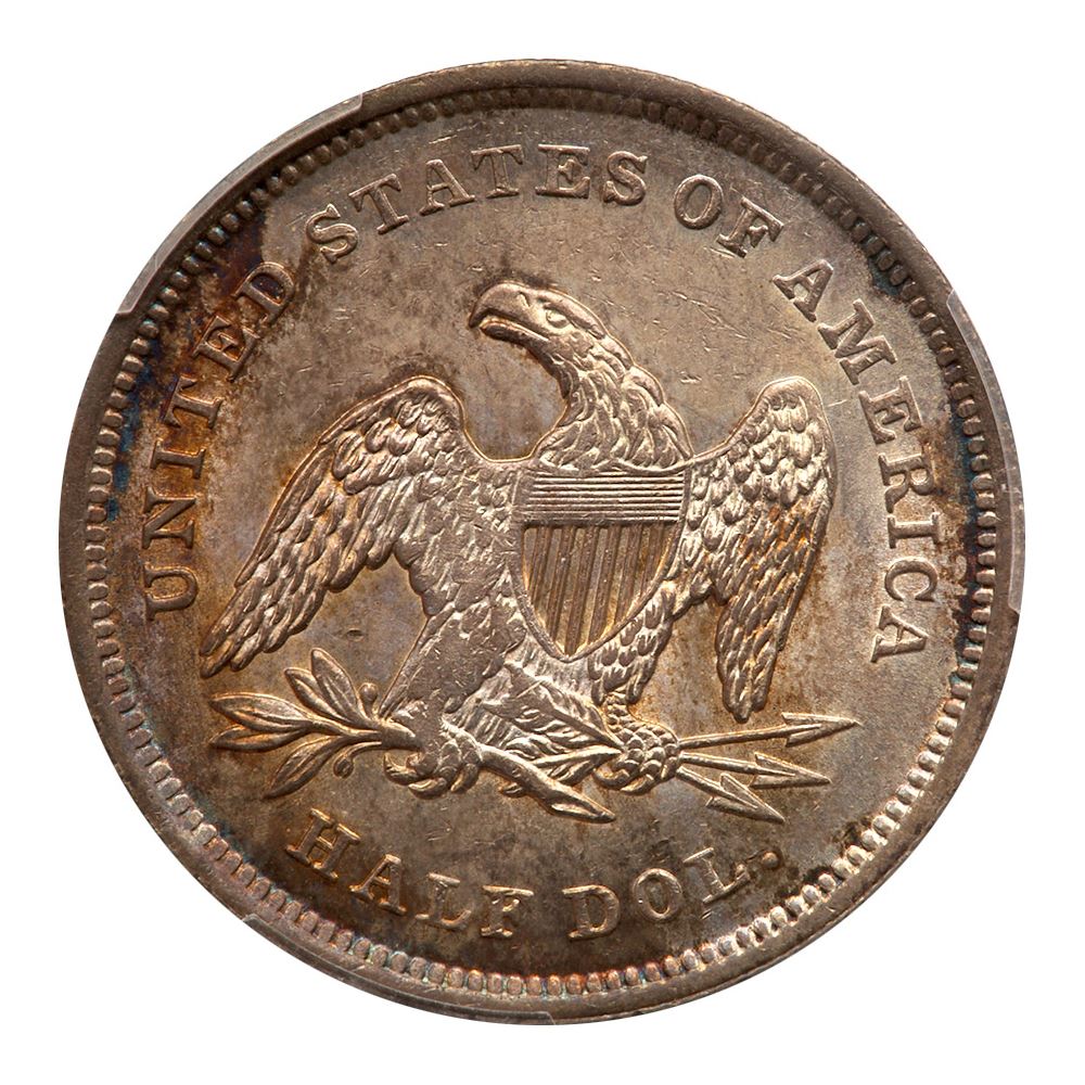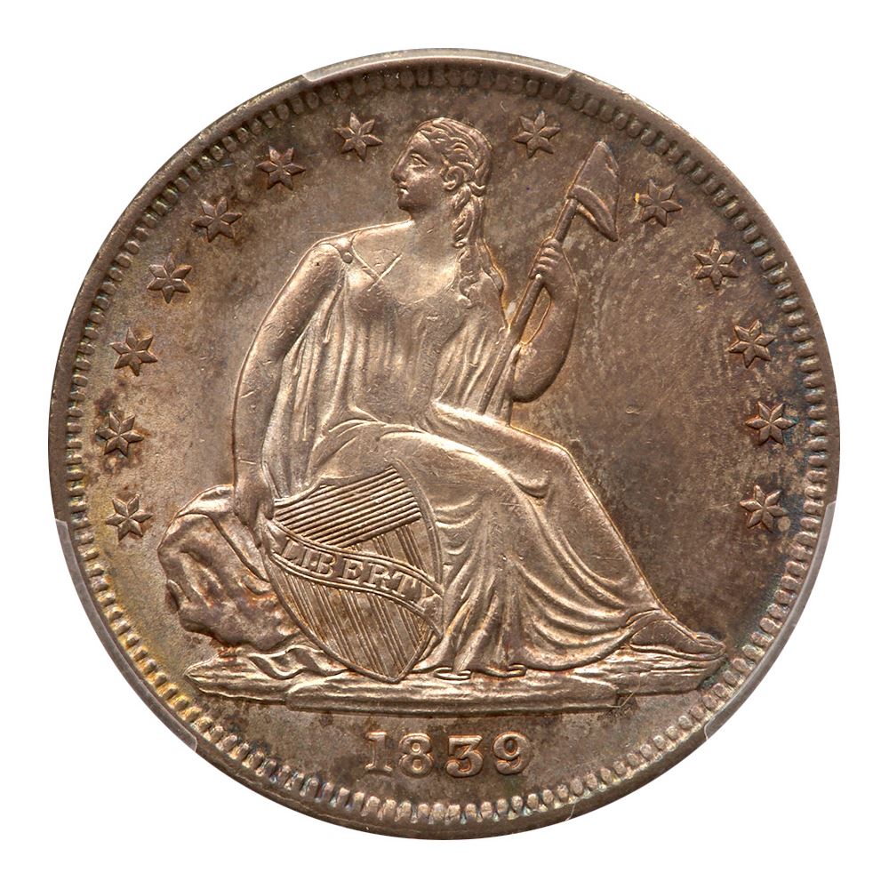 1839. No drapery. PCGS graded MS-64. Well struck in general with a few areas of minor softness on Libertys high points and the left side of the eagle. This is typically seen on this early Liberty Seated design for the half dollars. Lovely blue and gold toning on both sides. Only 100,000 struck, and this one is certainly near the very top of those known today. A numismatic delight! Pop 13; 5 finer, 4 in 65, 1 in 65+. PCGS # 6230 Estimated Value 25,000 - UP