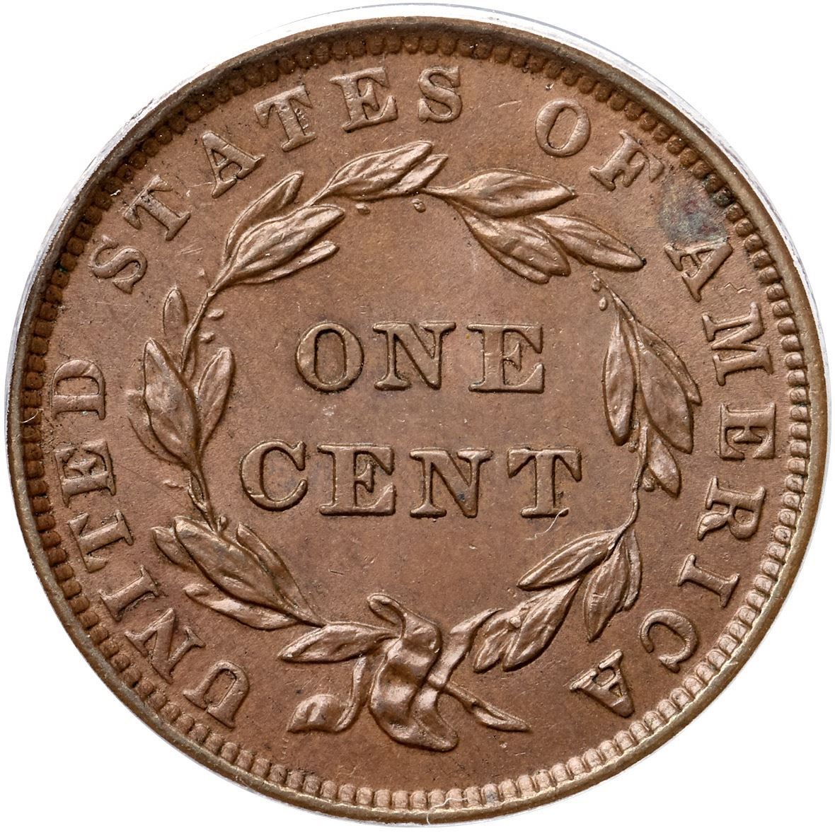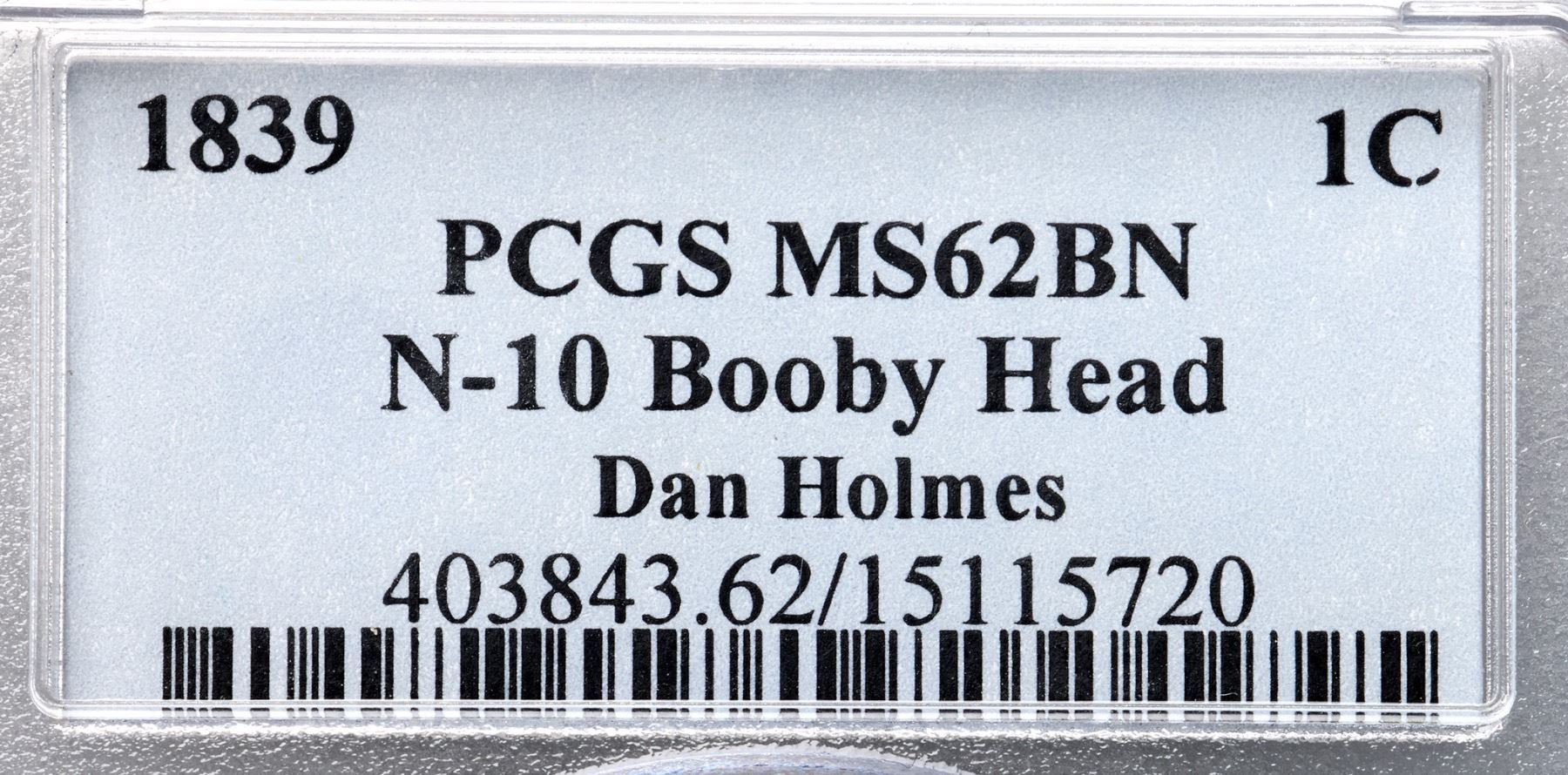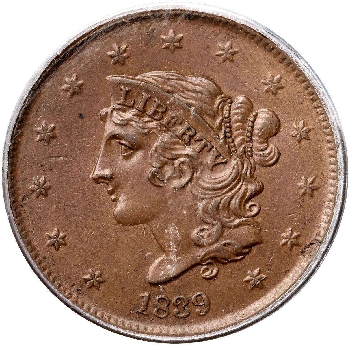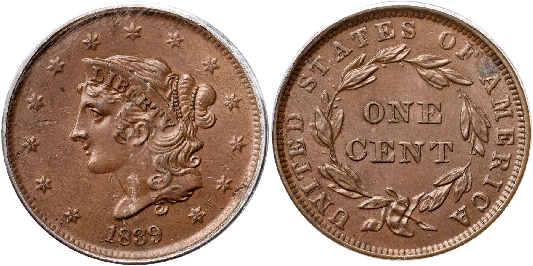1839 N-10 R3 Booby Head, PCGS graded MS62 BrownGlossy medium brown with underlying frosty flowline luster covering the fields and protected areas. A splash of bluish olive toning left of the first A in AMERICA and a shallow planchet flake at the dentils near star 12 are the best identifying marks, although there are a few light contact marks in the obverse fields. MDS. The obverse is covered with fine die flowlines, as always due to its earlier use in the N-5 marriage, and the reverse shows microscopic flowlines as well. Other than minor flowlines and die wear, there is no significant difference in die states for this variety. Called MS60 net AU55 and tied for CC#5 in the Noyes census, his photo #23312. Bland says AU55 and tied for CC#2 among the confirmed examples in his census. Our grade is AU55.Certificate Number: 403843.62/15115720Pedigree: Ex England-Elliot Landau, New Netherlands Coin Co. #52, 12/13/1958:155-Willard C. Blaisdell 9/1976-Del Bland-Jerry A. Bobbe 3/1977-R. E. "Ted" Naftzger, Jr., 1990 EAC Sale, lot 263-Wesley A. Rasmussen, Heritage Auctions 1/13/2005:3725-Daniel W. Holmes, Jr., McCawley & Grellman Auctions/Goldbergs 5/30/2010:554-Chris McCawley 2012-Terry S. Denman Collection