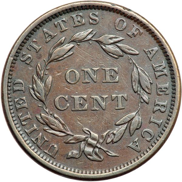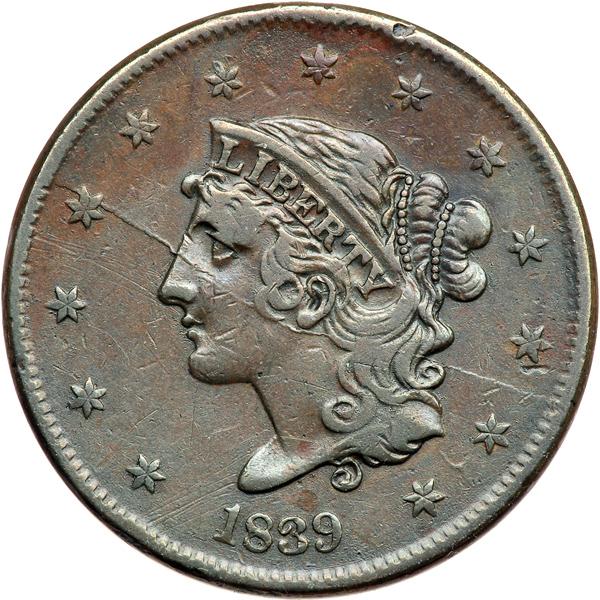 1839 N-12 R4+ VF20. Booby Head. VF-20. Five points sharper but there are some old hairline scratches from the bust tip to the dentils under star 1, a dull rim nick over star 8, a couple small rim nicks above the O in OF, plus some minor nicks scattered about the obverse. Glossy chocolate and olive brown with a small spot of reddish brown toning under the T in UNITED. LDS with a strong bisecting die crack across the obverse from the dentils at star 4 to the dentils under star 11. May be the discovery coin for the late die state (comes with a 1917 note from Henry Chapman stating this is the first he had seen). Called VF35 net VF25 and tied for CC#12 in the Noyes census, his photo #25843. Removed from an NGC slab graded EF45 (NGC label included). DWH #2639.