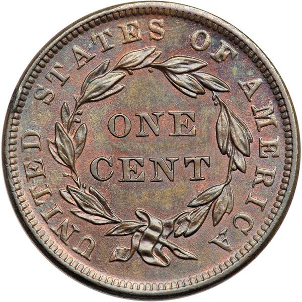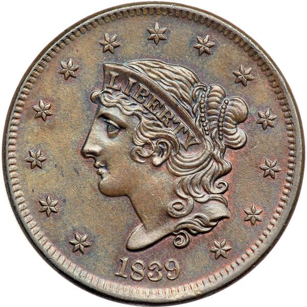1839 N-13 R2 MS60. Booby Head. PCGS graded MS-64 Brown. Attractive lustrous light olive brown with delicate overtones of bluish steel and generous traces of faded mint red in protected areas. The surfaces are satiny and choice. Would rate a higher grade if not for a small rim bump at the first S in STATES. M-LDS. There is a fine but clear die crack from the dentils over U through NITED STAT to the dentils over the adjacent E, plus another crack from ES to the dentils over O. (An example without any die cracks is unknown.) The fields on both sides covered with fine die flowlines. Called MS62 and CC#9 in the Noyes census, his photo #28190. Bland says MS60+ and tied for CC#7 in his census. Our grade is MS60. Pop 1; 1 in 66; 1 in 66RB. Only 3 graded at PCGS for the variety. DWH #1896.
