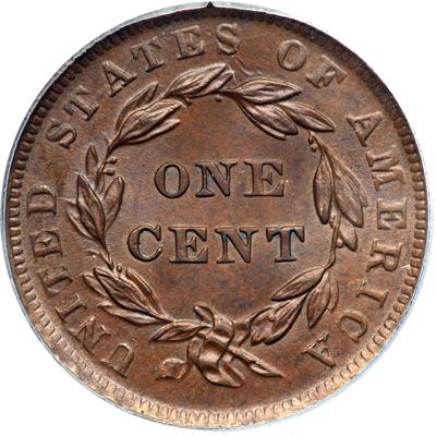 1839 N-13 R2. PCGS graded MS-65 Brown. Booby Head. Lustrous medium brown with attractive flowline luster covering the fields on both sides. No spots or stains, and the eye appeal is excellent. The only mark is a short, dull scratch under the right side of the second S in STATES, and it is very easily missed. LDS. Pop 14; 7 finer in 66BN.