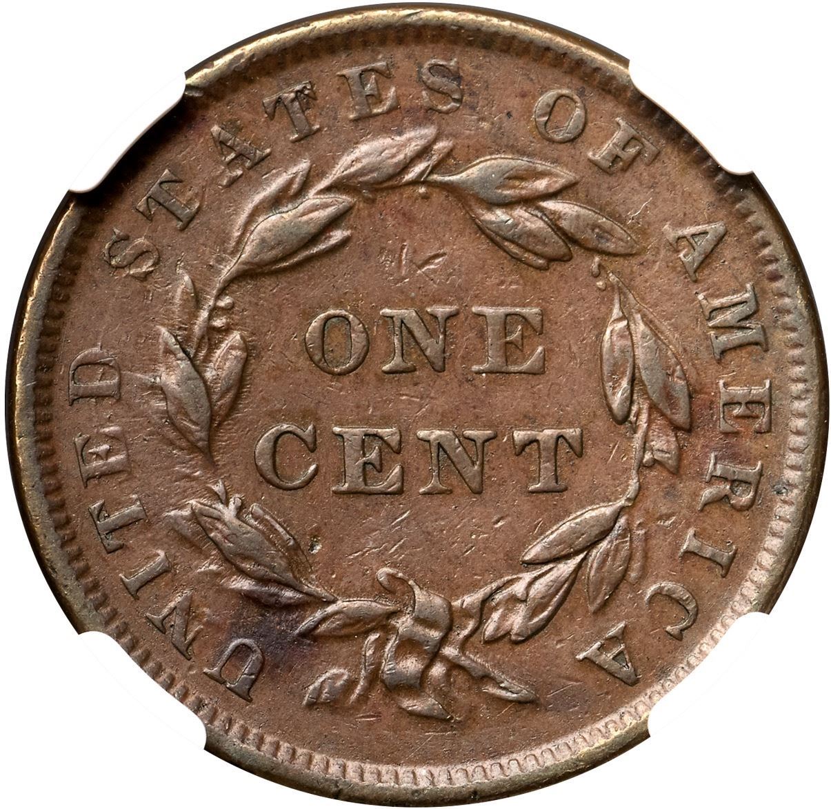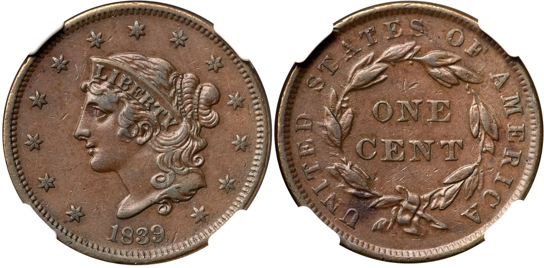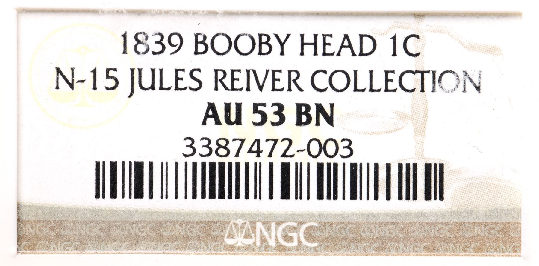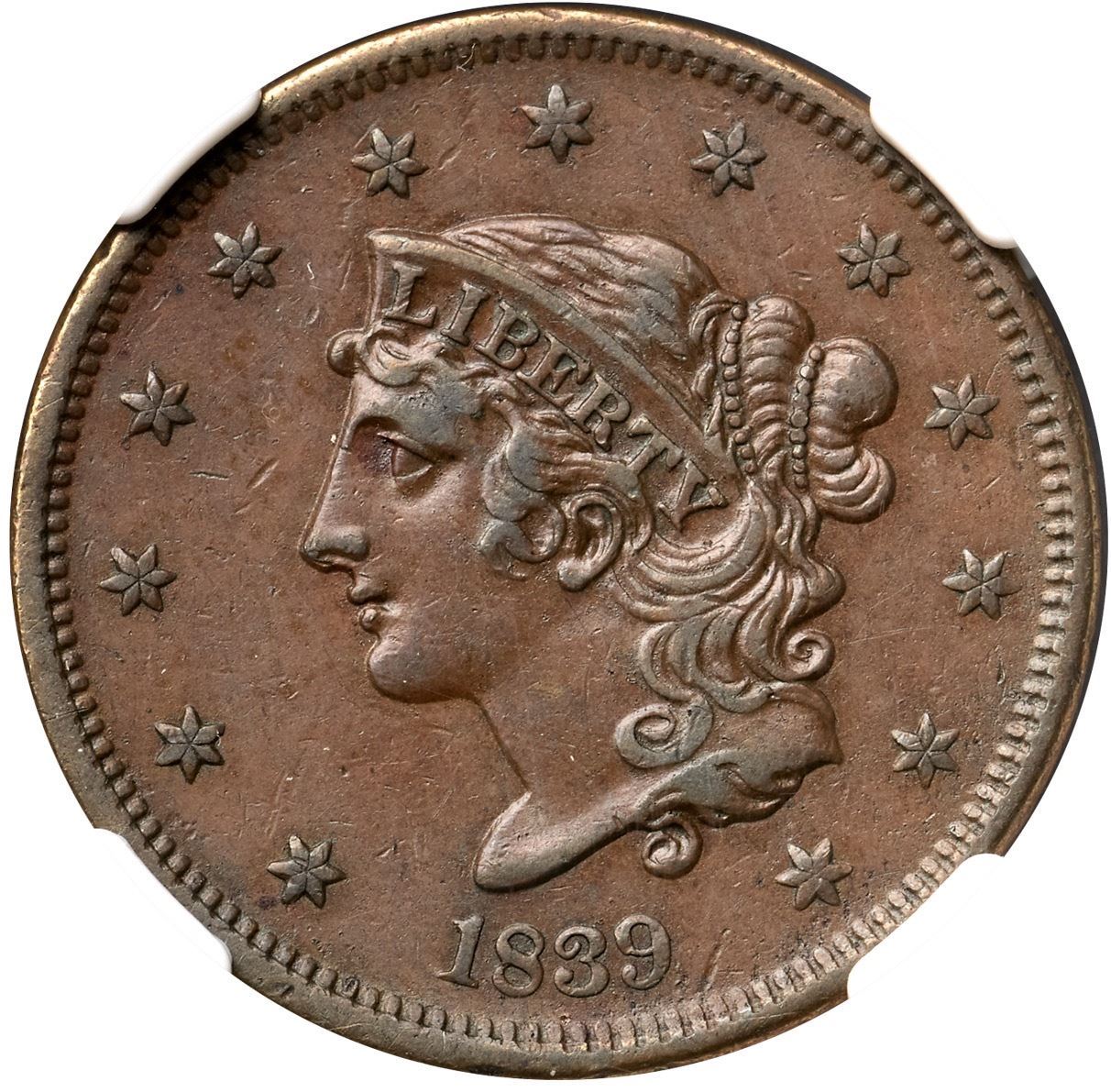 1839 N-15 R5+ Booby Head, NGC graded AU53Attractive glossy medium brown with a puff of darker olive brown toning under the U in UNITED. Smooth with light wear on the devices and only trivial contact marks; a small chip near the leaf under CE in CENT can help identify this cent. The attribution points are clear including the spike from the hair below the Y in LIBERTY. Graded EF45 net VF35 and tied for CC#2 in the Noyes census, his photo #27066. Our grade is VF35+, close to EF40.Certificate Number: 3387472-003Pedigree: Ex George Ramont 2/1967-Jules Reiver, Heritage Auctions 1/24/2006:20140-Terry S. Denman Collection