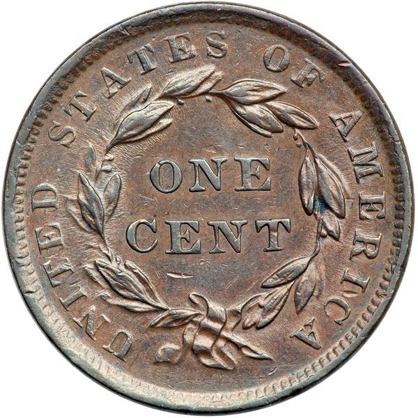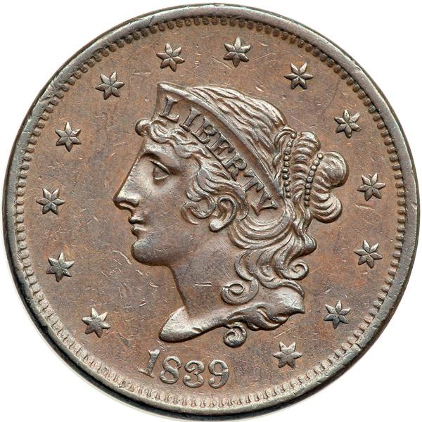 1839 N-15 R6- EF45. Booby Head. EF-45. Attractive glossy light to medium steel brown with frosty flowline luster covering the protected areas. There is a small carbon spot in the leaf under the E in AMERICA and a few tiny contact marks on each side, including a small nick on the bottom edge of the bust over the 9. EDS. The die state is virtually identical for all known example of this rare variety. The obverse die is new and the details are crisp while the reverse die is heavily worn and cracked at NITED-STAT. Excellent eye appeal. Second finest according to the Noyes census, and tied for second finest at EF45 if you use the Bland census. Removed from an NGC slab graded AU58BN. The attribution and Ron Adam provenance are shown on the NGC label, which is included. DWH #2520.