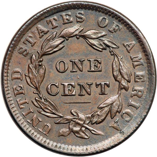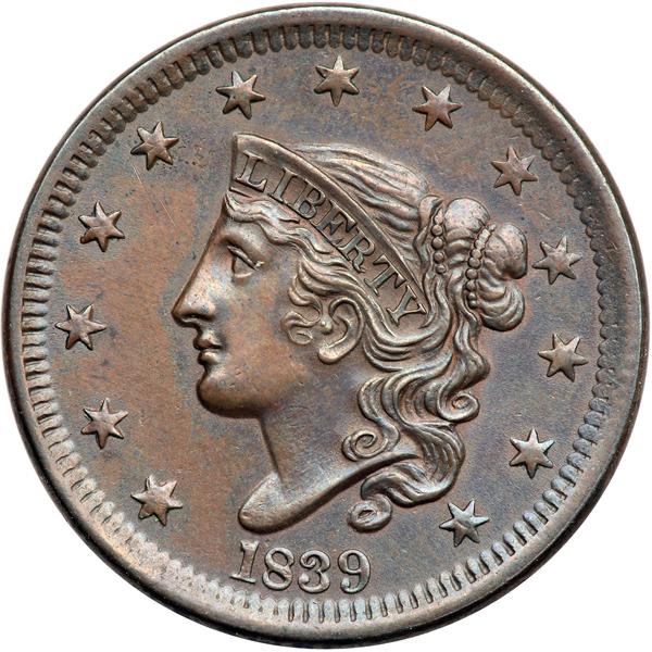 1839 N-2 R2. Head of 1838. AU-58. Glossy medium brown and chocolate with light bluish steel overtones in protected areas. Just a hint of rub on the highpoints from mint state. A tiny planchet flake in the dentils over the second A in AMERICA is the only notable mark. Nicely struck EDS with strong die lines from the dentils to STA and RICA.DWH #3328 (PCGS # 37225) .
