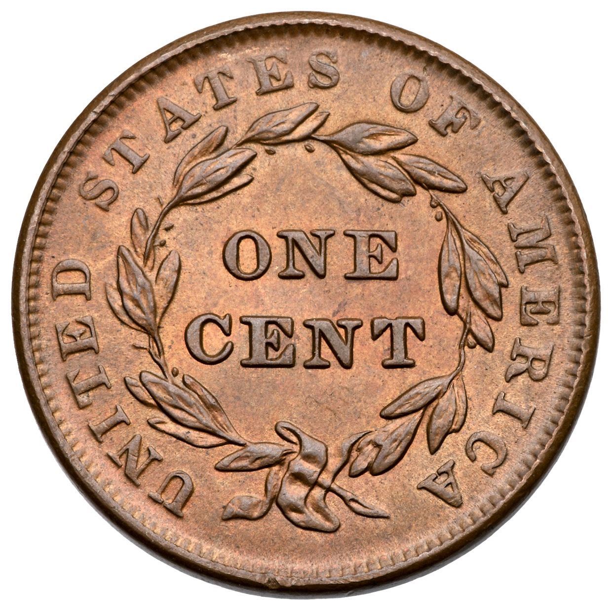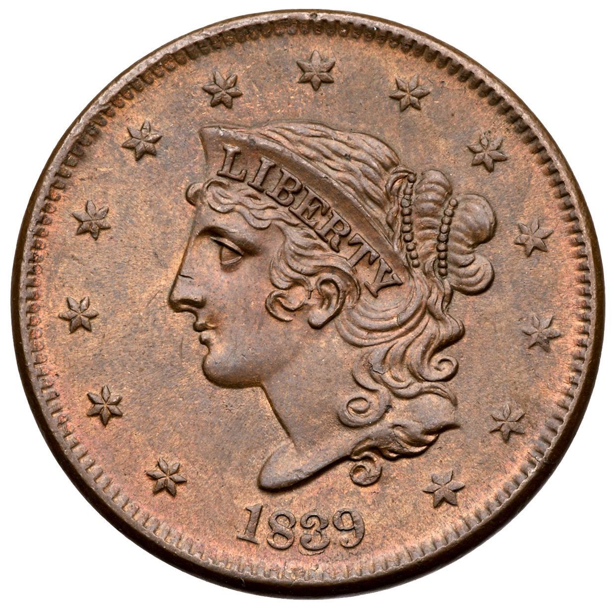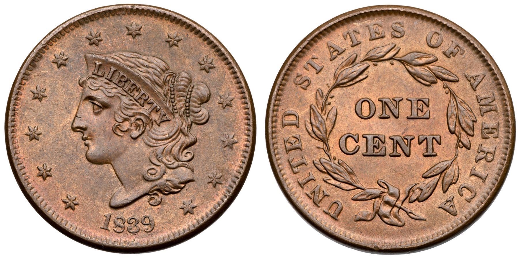 1839 N-5 R2 Booby Head MS63+Very attractive lustrous light olive and steel brown with mellowed mint red in the fields and protected areas, especially on the reverse where the faded red is dominant. An impressive cent. No spots or stains, only a few minor marks. These include a thin horizontal nick on the nose, a tiny planchet lamination just below the 3 in the date, and a thin diagonal scuff over NE in ONE. MDS with microscopic die flowlines covering the fields. A beautiful cent, very close to MS64 in our opinion. Called MS65 choice and tied for CC#1 in the Noyes census, his photo #20938. Bland says MS65 and CC#3. Any way you look at it this is a great Booby Head cent.Certificate Number: Pedigree: Ex A. Reiswig (Common to Key Coin Co.)-Robert E. Vail-Del Bland 5/1974-Jerry A. Bobbe-Myles Z. Gerson-R. E. "Ted" Naftzger, Jr.-Naftzger Estate, McCawley & Grellman Auctions/Goldbergs 2/1/2009:452-William R. Eckberg, McCawley & Grellman Auctions/Goldbergs 5/31/2015:306-Terry S. Denman Collection