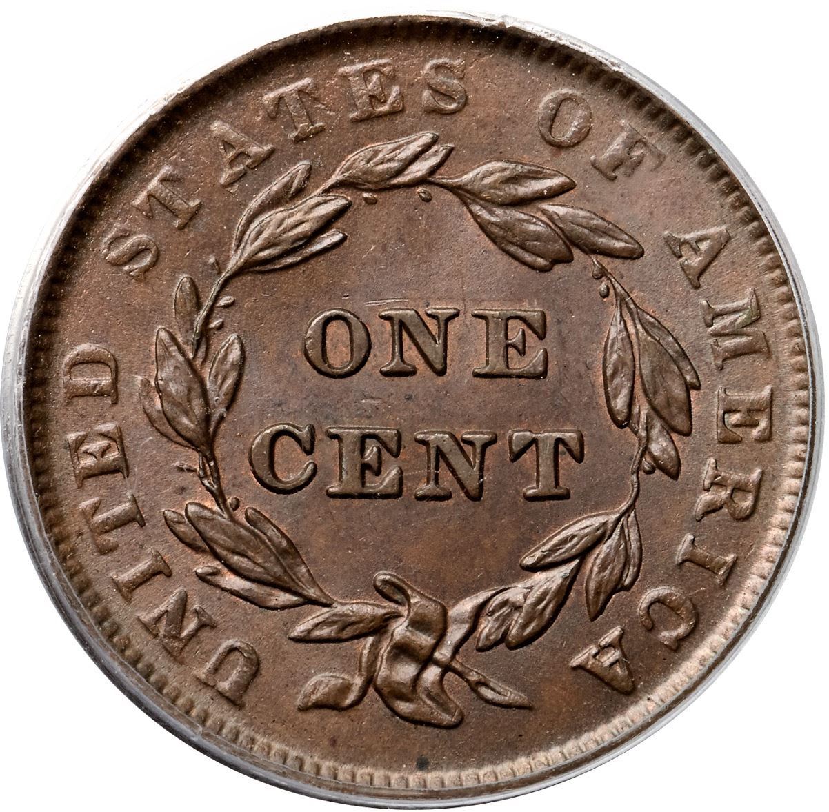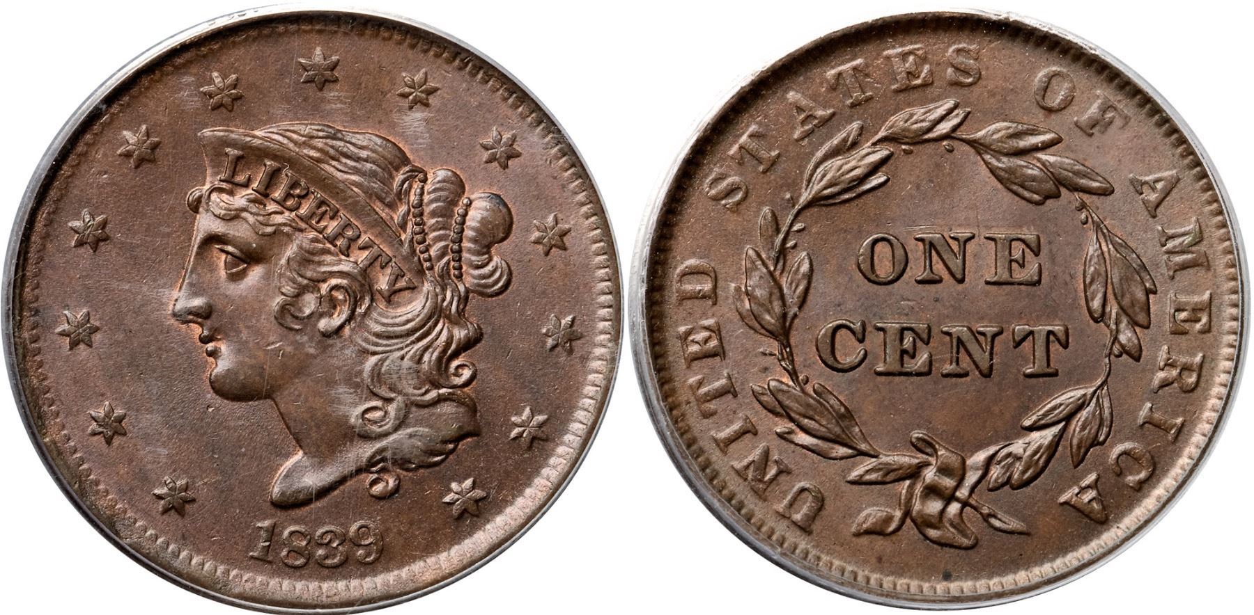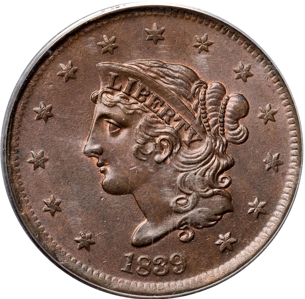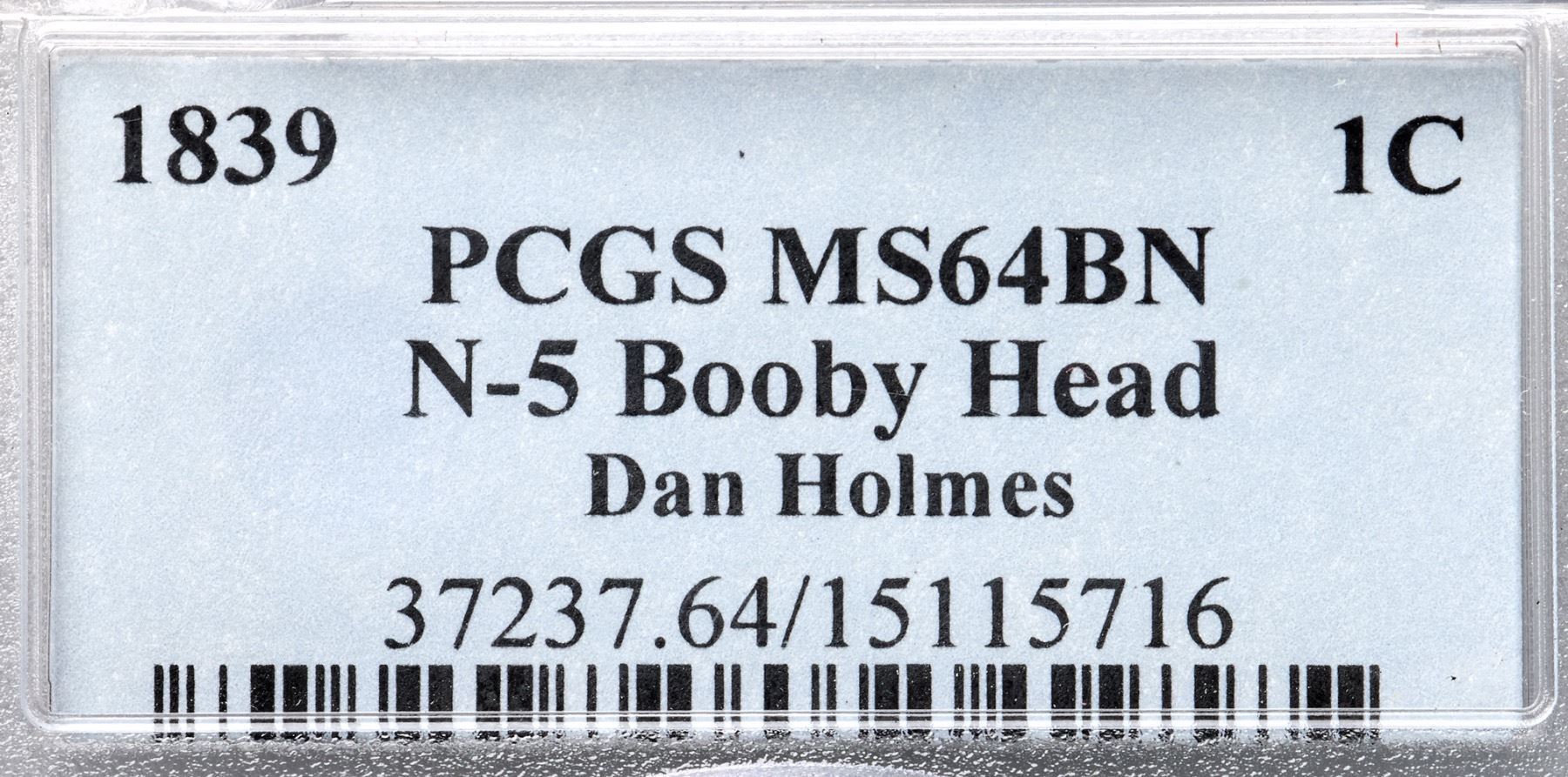 1839 N-5 R2 Booby Head, PCGS graded MS64 BrownFrosty light bluish steel brown with traces of mint red in protected areas. Satiny mint luster covers this cent and the eye appeal is quite nice. A tiny nick on the cheek near the jawline and a speck of very light carbon at the dentils under the wreath are the notable defects, and they are not significant. MDS, die state b. The fields are covered with fine radial flowlines and the dentils are blurry. The early die lines over NITED are gone. An attractive Booby Head cent that comes with a special provenance. Purchased as a 65th birthday gift for Dan Holmes by his wife Joan. Graded MS62 and tied for CC#6 in the Noyes census, his photo #74765. Our grade is MS60+. (The holder is scuffed.)Certificate Number: 37237.64/15115716Pedigree: Ex Tony Terranova, 2003 EAC Sale, McCawley & Grellman Auctions 4/26/2003:708-Chris McCawley 6/28/03-Joan Holmes-gift to Dan Holmes as 65th birthday present-Daniel W. Holmes, Jr., McCawley & Grellman Auctions/Goldbergs 5/30/2010:547-Terry S. Denman Collection