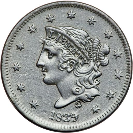 1839 N-5 R2 Booby Head VF35. Ten points sharper but covered with extremely faint roughness under a glossy dark olive and steel patina. No verdigris, and the only marks are a light rim bruise at star 2 and a tiny scratch from star 5 to the curl on the forehead. Decent eye appeal in spite of the dark toning. Nicely struck EDS.
