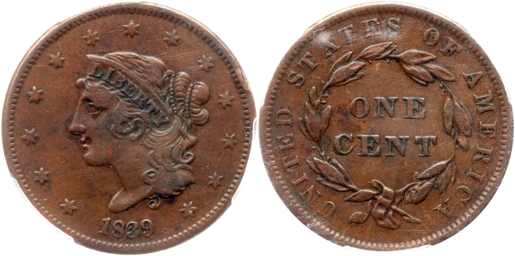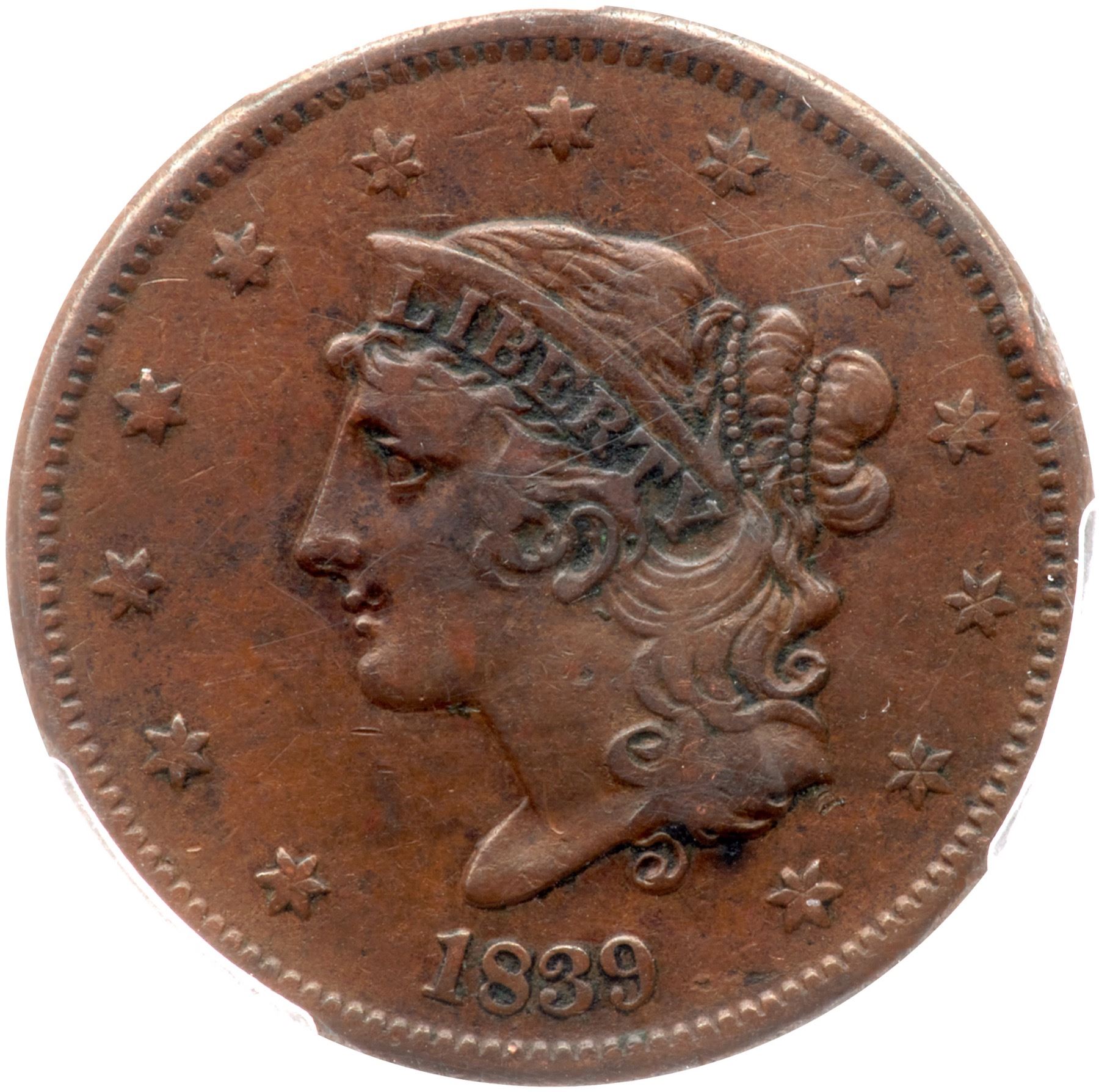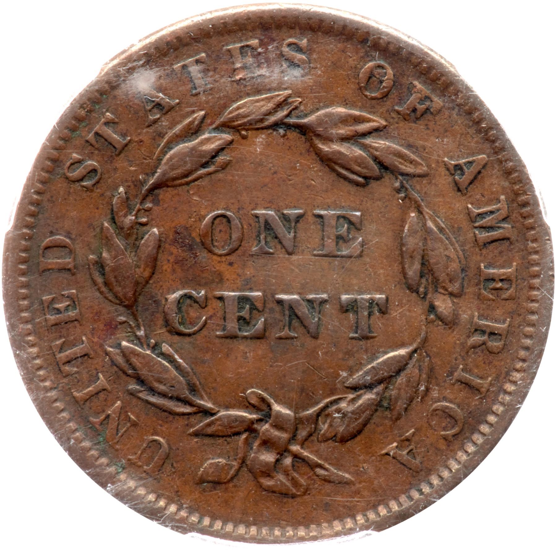 Tan and brown. Some crud caked in some devices and around LIBERTY. Free of distracting marks.