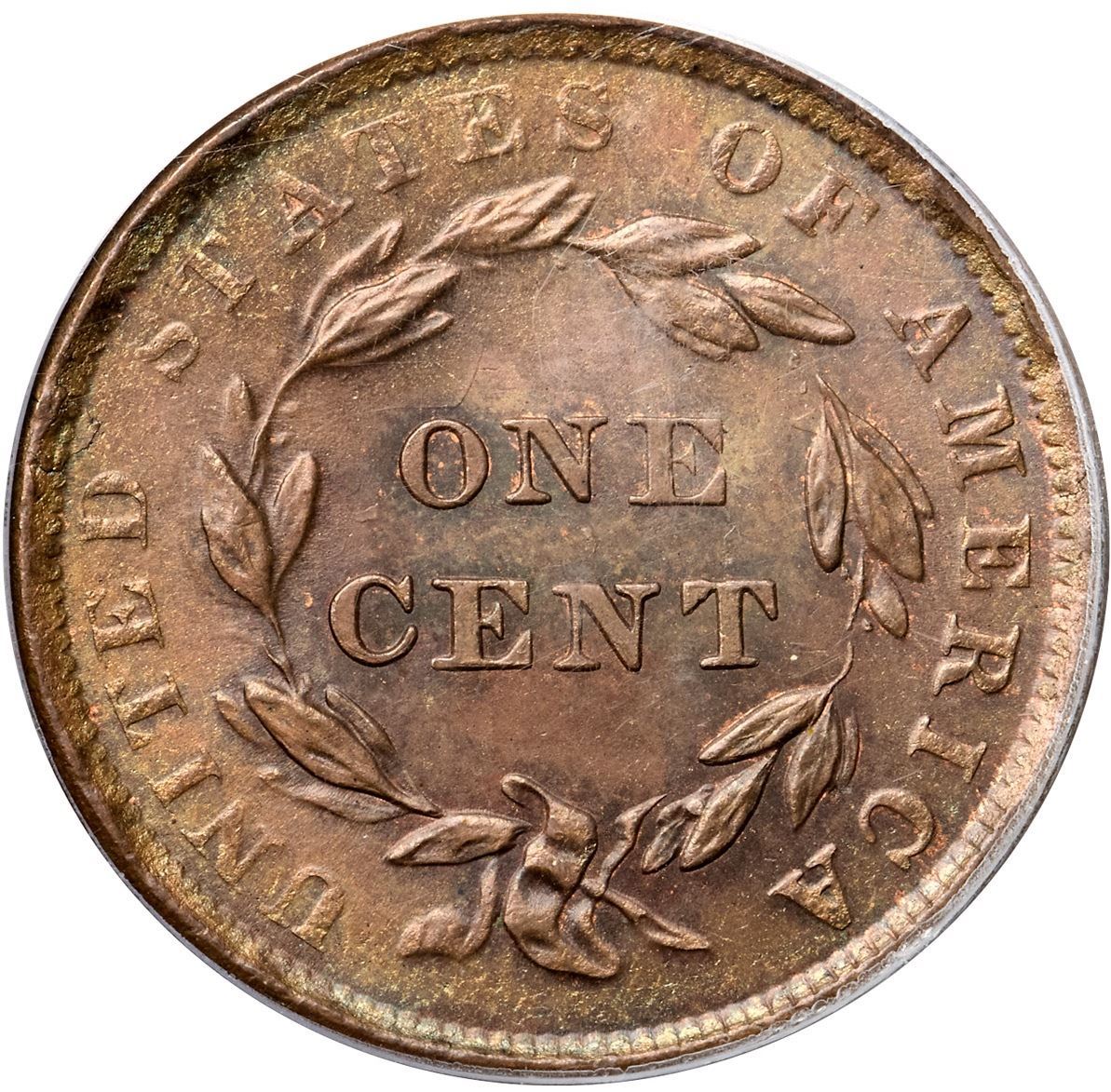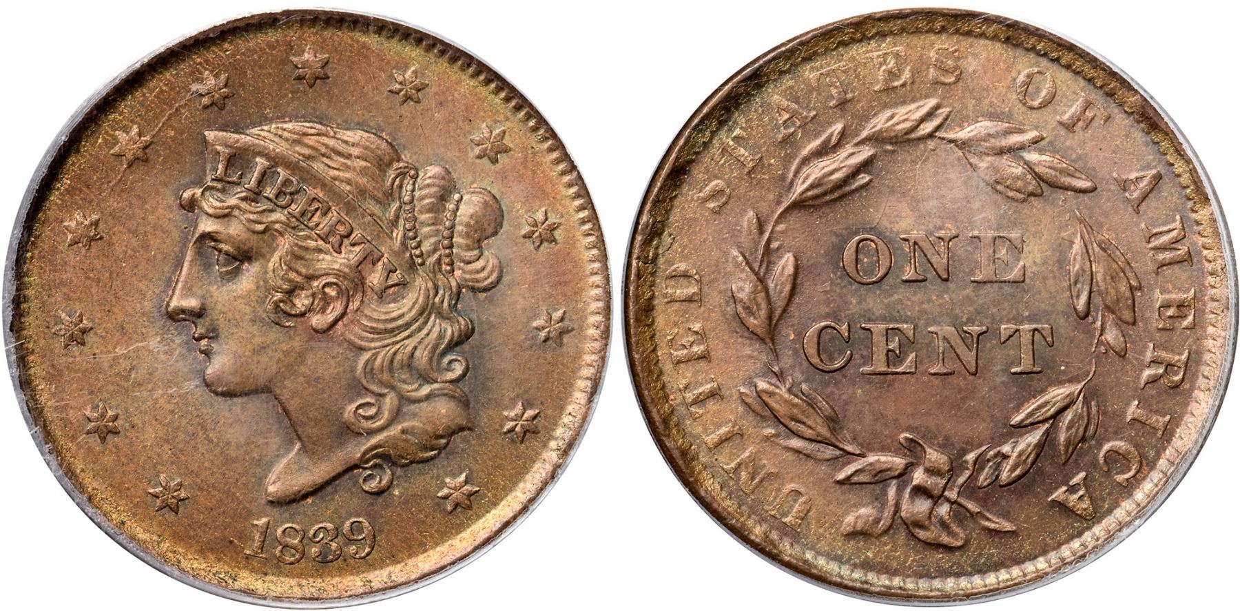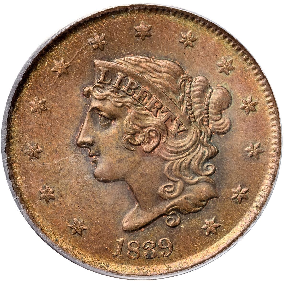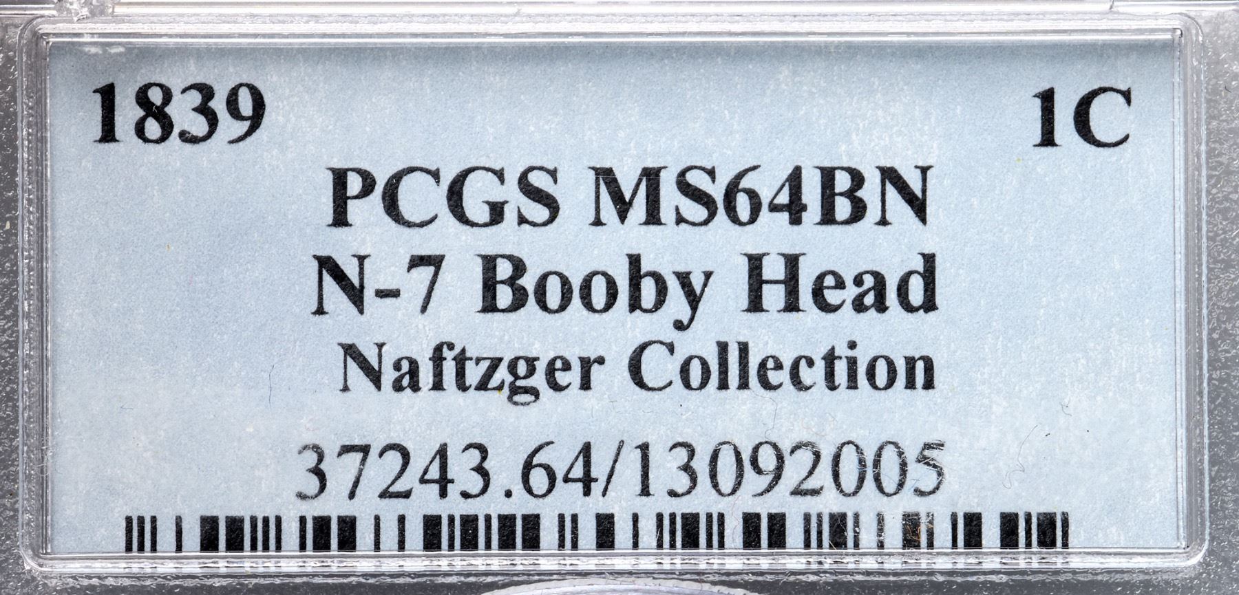 1839 N-7 R2 Booby Head, PCGS graded MS64 BrownFrosty golden brown and light bluish steel with subtle overtones of sea green and peeps of mint color in the protected areas on both sides. No spots, stains, or contact marks, but there are many microscopic planchet flakes in and near the dentils on both sides. A faint planchet lamination at the dentils just right of the D in UNITED can help identify this cent. M-LDS, die state c. The die cracks on the obverse are clear and die clashmarks show inside the wreath including an impression of the inner ear over the N in CENT. Called MS63 and tied for CC#3 in the Noyes census, his photo #27000. Bland says MS64 and CC#2. Our grade is MS63.Certificate Number: 37243.64/13092005Pedigree: Ex Kagin's 2/1982:148 (where misattributed as N-6)-John J. Nicholas, Superior 2/2/1992:619-R. E. "Ted" Naftzger, Jr.-Naftzger Estate, McCawley & Grellman Auctions/Goldbergs 2/1/2009:455-Chris McCawley 2013-Terry S. Denman Collection