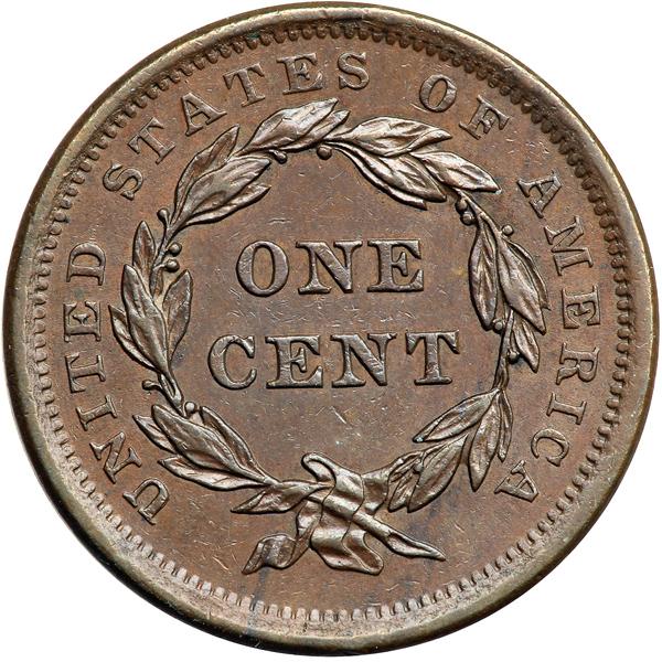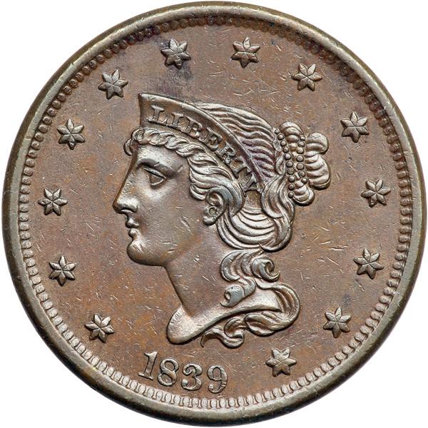 1839 N-8 R1 EF40. Head of 1840. EF-40. Five points sharper but lightly cleaned, now retoned glossy medium brown. The only mark is a small area of slightly darker toning under star 6, and this patch shows some extremely fine roughness. EDS. The dentils are sharp and the fields are smooth. A sharp die line connects the lower berry left of the O in ONE to the highest leaf below. DWH #1722.