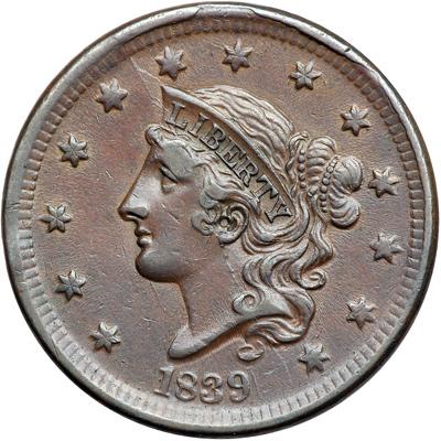 1839 N-9 R2. VF-35. Silly Head. Slightly sharper with a small rim bruise at the second T in STATES. Frosty chocolate and olive with dark steel highpoints. LDS with rim cud breaks at star 6, stars 7-8, and stars 9-11.