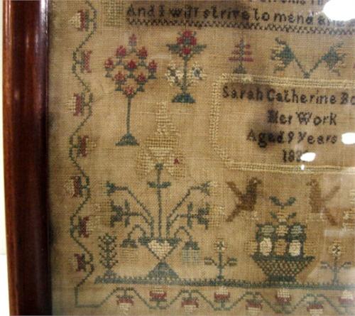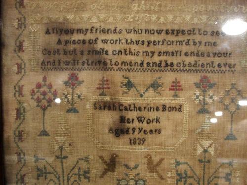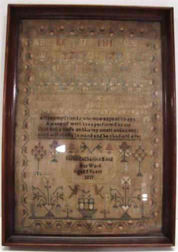 1839 FRAMED NEEDLEPOINT ALPHABET SAMPLER. Identified at bottom “Sarah Catherine Bond/Her Work/Aged 9 Years/1839”. Text at center reads “All you my friends who now expect to see/A piece of work thus performe’d by me/Cast but a smile on this my small endeavour/And I will strive to mend and be obedient ever”. Sampler shows some water damage and wear. 13.5” x 19” framed.