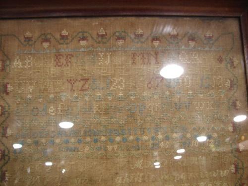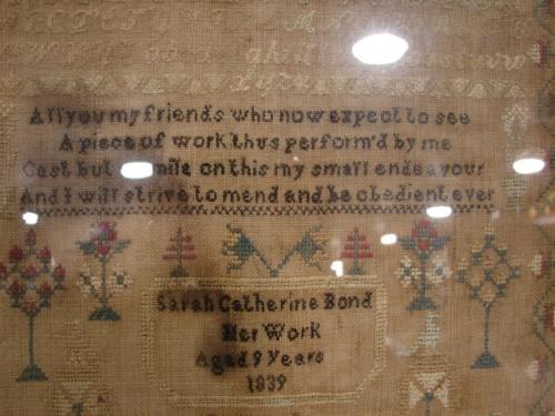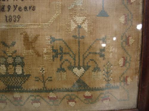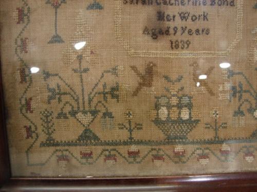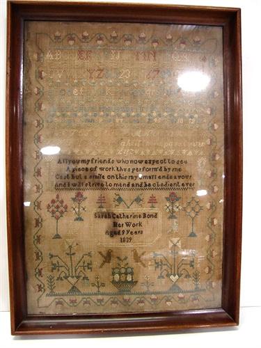 1839 FRAMED NEEDLEPOINT ALPHABET SAMPLER. Identified at bottom “Sarah Catherine Bond/Her Work/Aged 9 Years/1839”. Text at center reads “All you my friends who now expect to see/A piece of work thus performe’d by me/Cast but a smile on this my small endeavour/And I will strive to mend and be obedient ever”. Sampler shows some water damage and wear. 13.5” x 19” framed.