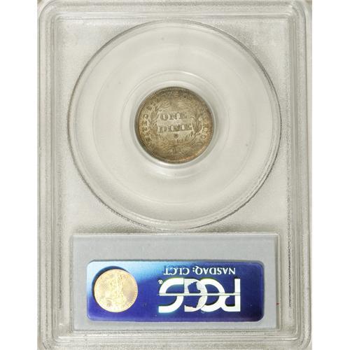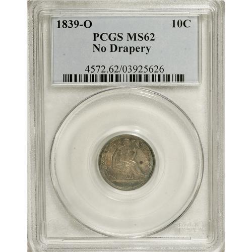 <B>1839-O 10C No Drapery MS62 PCGS.</B></I> A vividly toned example of this early New Orleans issue, predominantly silver-gray in the centers with blue-green patina at the obverse periphery and gold-orange toning at the reverse rims. An isolated spot of turquoise appears in the right obverse field. Population: 5 in 62, 11 finer (3/07).<BR><BR><b>Shipping:</b> Coins & Currency (<a target="_blank" href="http://www.heritageauctions.com/common/shipping.php">view shipping information</a>)