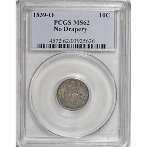 <B>1839-O 10C No Drapery MS62 PCGS.</B></I> A vividly toned example of this early New Orleans issue, predominantly silver-gray in the centers with blue-green patina at the obverse periphery and gold-orange toning at the reverse rims. An isolated spot of turquoise appears in the right obverse field. Population: 5 in 62, 11 finer (7/07).<BR><BR><B>Coin Engraver:</B> Christian Gobrecht<BR><BR><b>Shipping:</b> Coins & Currency (<a target="_blank" href="http://www.heritageauctions.com/common/shipping.php">view shipping information</a>)