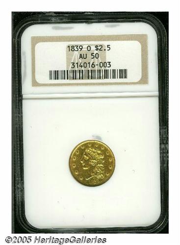 <B>1839-O<$2 1/2> AU50 NGC.</B></I> High Date, Wide Fraction, Breen-6152, McCloskey-A, R.3. Substantial bright luster bathes this lightly marked and nicely struck New Orleans example. The left obverse field has a dash of russet patina.<BR><I>From The Stig Ericsson Collection.</B></I>