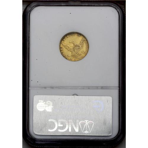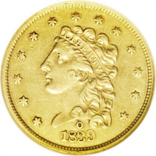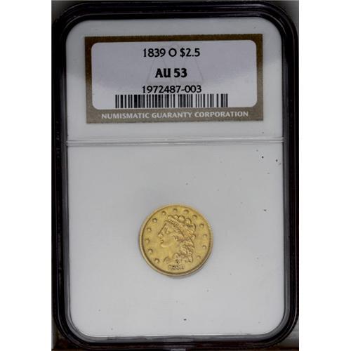 <B>1839-O<$2 1/2> AU53 NGC.</B></I> High Date, Wide Fraction, Breen-6152, McCloskey-A, R.3. The only Classic quarter eagle produced in the New Orleans Mint, the '39-O is an immensely popular coin among Southern gold specialists. Despite a paltry original mintage of 17,781 pieces, the 1839-O is the second most common O-mint quarter eagle after the 1843-O Small Date, and it is the easiest to obtain in grades above the XF level of preservation. This is a sharply detailed example with rich reddish-gold color and a few sprays of lighter patina here and there. A small planchet indention and a few scratches to the left of the eagle are somewhat distracting, but there are few other noteworthy abrasions. Some original mint luster adheres to the protected areas around the peripheries. <BR><BR><B>Important notice:</B> Heritage usually auctions material at the rate of 200-250 lots per hour. On some occasions eBay Live bid software or the Internet may not be able to keep up with the pace of the auction. We recommend placing a realistic absentee bid now as insurance to avoid disappointment. Occasionally the auctioneer may eliminate or reject an eBay Live bid, and the auctioneer may also reopen a lot after the close of the eBay live bidding (usually because we missed an audience bid), and may reject your bid even if it shows you as the winning bidder. By bidding via eBay Live, you agree that Heritage may award the lot to another bidder at its sole discretion under the circumstances described above or any other reasonable circumstances. Since eBay bids are not shown to us until we open the lot on the floor, we treat those bids just like floor bids. In most cases the floor responds before the eBay bid is presented to us, due to Internet lag time, so for consistency we have made it a policy that floor bids are always considered first over tie eBay live bids. Also please note that all Heritage lots purchased through eBay Live carry a 20% Buyer's Premium. Please make sure you read the Terms and Conditions before you bid. This lot is being auctioned in conjunction with a live floor auction by Heritage Galleries & Auctioneers. All final auction and invoice information will be supplied by Heritage Galleries & Auctioneers, and all other information should be considered preliminary. Lot:2352 <BR><BR><B>Winning Notification and Billing:</B> After the FINAL session in this auction is complete, Heritage will send e-mail and snail mail invoices. This process normally takes several days. All final auction and invoice information will be supplied by Heritage Galleries & Auctioneers, and all other information should be considered preliminary. <BR><BR>This auction will be conducted on a live auction floor and over the Internet through eBay Live. If you choose to place an absentee bid, please take a moment to <font color='#0000ff'><u><a href='http://pages.ebay.com/liveauctions/help/before/laabsentee.html'>learn how eBay Live absentee bidding works</a></u></font><font color='#000000'>