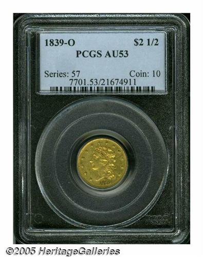 <B>1839-O<$2 1/2> AU53 PCGS.</B></I> High Date, Wide Fraction, Breen-6152, McCloskey-A, R.3. An attractive lightly circulated example with matte-golden color and a few light abrasions. A nice example of this obverse-mintmarked Dixie issue.