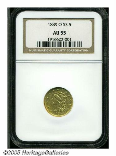 <B>1839-O<$2 1/2> AU55 NGC.</B></I> High Date, Wide Fraction, Breen-6152, McCloskey-A, R.3. Generally bright with tinges of light reddish color here and there. The strike is more than adequate for this desirable New Orleans issue, one of just 17,781 pieces struck.