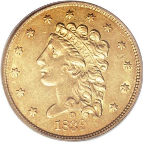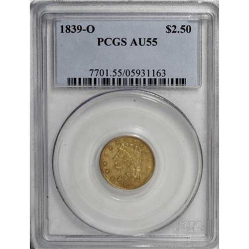 <B>1839-O $2 1/2 AU55 PCGS.</B></I> High Date, Wide Fraction, Breen-6152, McCloskey-A, R.3. The '39-O is essentially for New Orleans type sets, since it is the sole Classic quarter eagle issue. The low mintage of 17,781 ensures its scarcity. Two die varieties are known, with the Wide Fraction variety a bit more available. This almond-gold piece has a pleasing strike and smooth, subdued surfaces. Luster is particularly copious across the eagle and reverse border.<BR><BR><B>Coin Engraver:</B> William Kneass<BR><BR><b>Shipping:</b> Coins & Currency (<a target="_blank" href="http://www.heritageauctions.com/common/shipping.php">view shipping information</a>\)