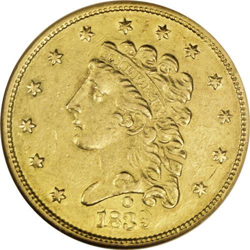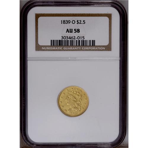 <B>1839-O $2 1/2 AU58 NGC.</B></I> High Date, Wide Fraction, Breen-6152, McCloskey-A, R.3. Although the New Orleans Mint struck its first silver coins in 1838, gold coins were not struck until the next year, when 17,781 quarter eagles were produced. Two die pairs were used for this emission. This partly lustrous piece is nicely struck and has only a few small marks, none of which are significant.