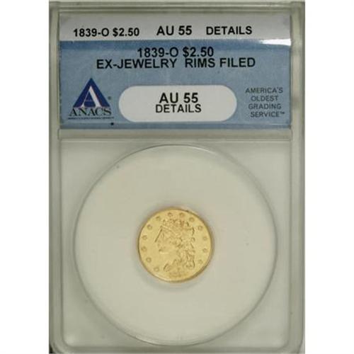 <B>1839-O $2 1/2 --Ex-Jewelry, Rims Filed--ANACS. AU55 Details.</B></I> High Date, Wide Fraction, Breen-6152, McCloskey-A, R.3. A clean and bright example that is in constant demand as the only New Orleans Classic Head gold issue. The reverse is the widely spaced fraction variety, identifiable because the 1 and 2 do not touch the fraction bar. Thankfully for the viewer, the coin's placement in a snug slab neuters the visual effect of the filed rims and the coin's former life as an object of personal adornment.<BR><BR><B>Coin Engraver:</B> William Kneass<BR><BR><b>Shipping:</b> Coins & Currency (<a target="_blank" href="http://www.heritageauctions.com/common/shipping.php">view shipping information</a>)