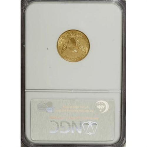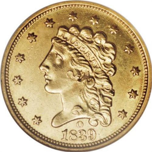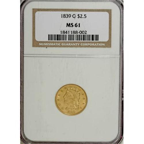 <B>1839-O $2 1/2 MS61 NGC.</B></I> Low Date, Close Fraction. McCloskey-B, R.4. An elusive quarter eagle variety from the Close Fraction reverse with both elements of the fraction touching the diagonal fraction bar on the reverse. The reverse is also inverted and has a horizontal bisecting die crack from the right wing to the eagle's head, the left wing, and the border. Both sides have brilliant mint frost with bright yellow-gold luster. In addition to its importance as a scarce variety, this quarter eagle represents the first issue of the denomination coined at New Orleans, and the only issue of the design produced at the new facility.<BR><BR><B>Coin Engraver:</B> William Kneass<BR><BR><b>Shipping:</b> Coins & Currency (<a target="_blank" href="http://www.heritageauctions.com/common/shipping.php">view shipping information</a>)