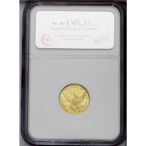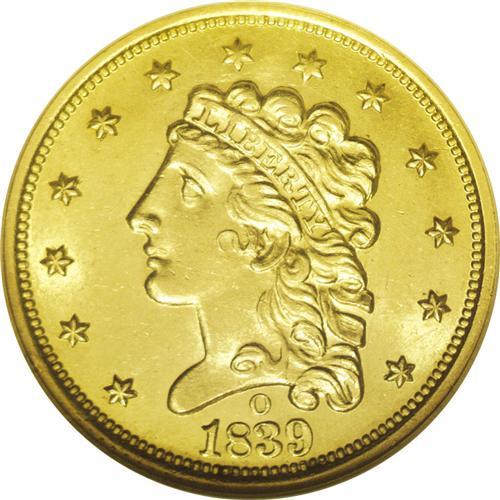 <B>1839-O<$2 1/2> MS62 NGC.</B></I> Low Date, Close Fraction. Breen-6153, McCloskey-B, R.4. Despite a mintage of less than 18,000 examples, this issue is available, if scarce, in Mint State. Perhaps the obverse mintmark--very much a new phenomenon in U.S. coinage, promulgated by three branch mints during this year--led to examples being saved, although several C- and D-mint issues from 1838 and 1839 are still extremely elusive in Mint State. This is a popular one-year type coin, and the only O-mint quarter eagle with the Classic Head obverse design.<BR> This piece is the Low Date, Close Fraction variety, which is a bit more elusive than the High Date, Wide Fraction variant. Although many pieces encountered are weakly struck on the hair below the coronet and on the eagle's left (facing) wing and claws, this example shows weakness in neither of those places; in fact, the <I>strike is delectably bold throughout both sides.</B></I> Much luster radiates from the pleasing yellow-gold surfaces. Like some other examples of this issue, this piece is <I>struck in medallic turn rather than coin turn,</B></I> with the top of the head of the eagle opposite the top of the head of Liberty. A light die crack runs from the left serif of the first A in AMERICA, through the right (facing) wing and the neck. Although neither service breaks down the surviving population into the two varieties, this piece could conceivably be among the top survivors of this scarcer variety.