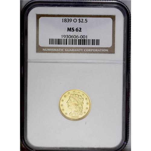 1839-O $2 1/2 MS62 NGC. Low Date, Close Fraction. Bree